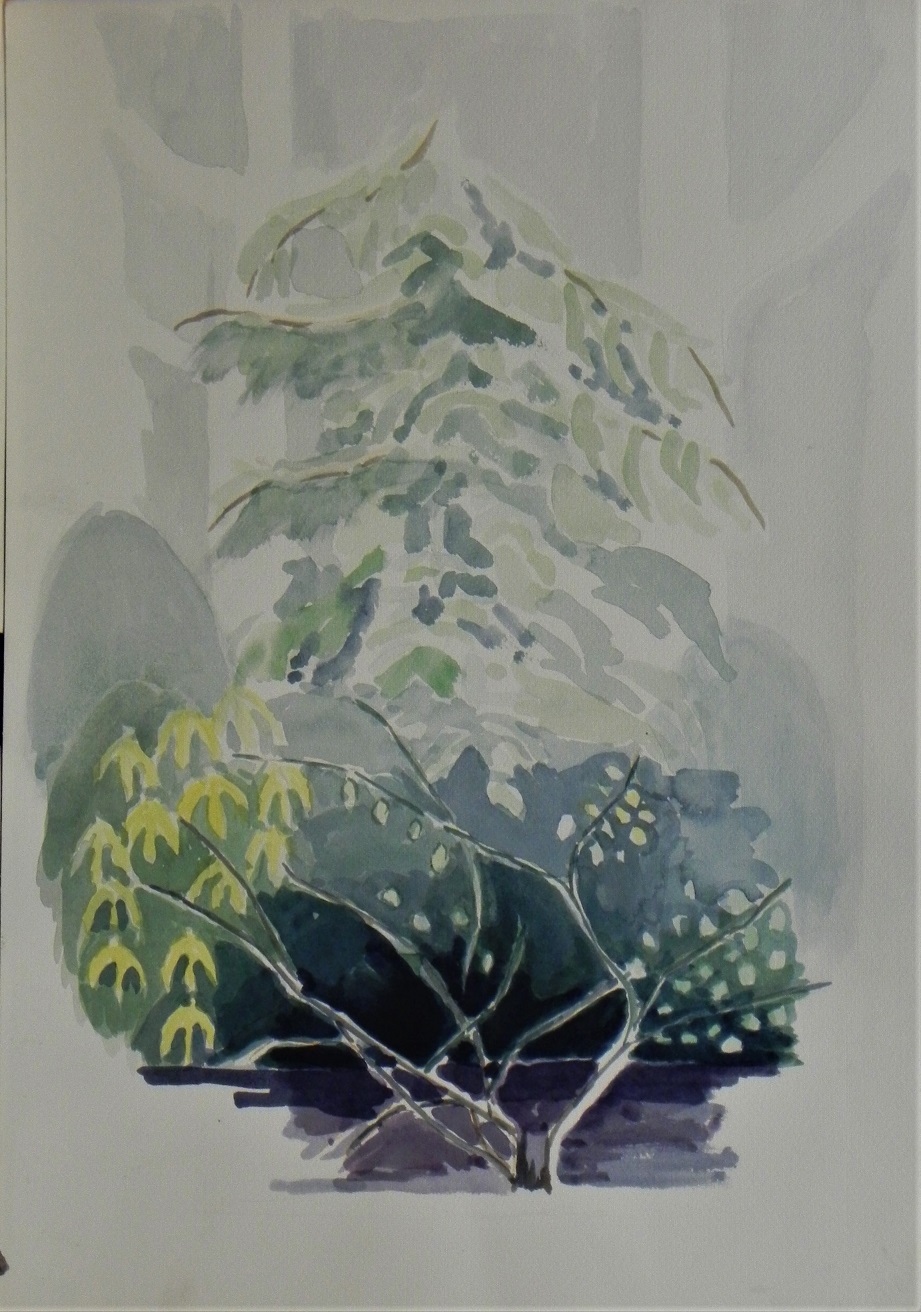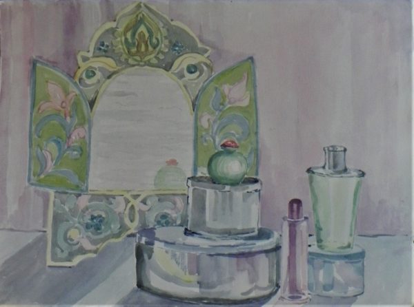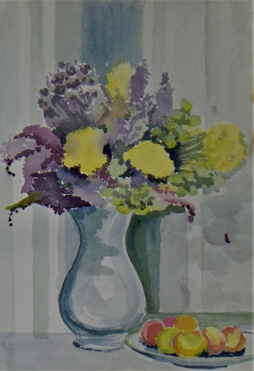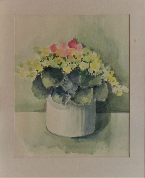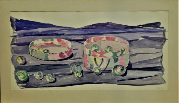 Ooit gekocht op een veiling omdat vele aquarellen van de voor ons onbekende aquarellist uit deze kavel ons meer dan aanspraken. In totaal zijn het er – variërend van bloemstillevens tot cultuurbossen en van interieurs tot fantasiefiguren – vierenveertig.