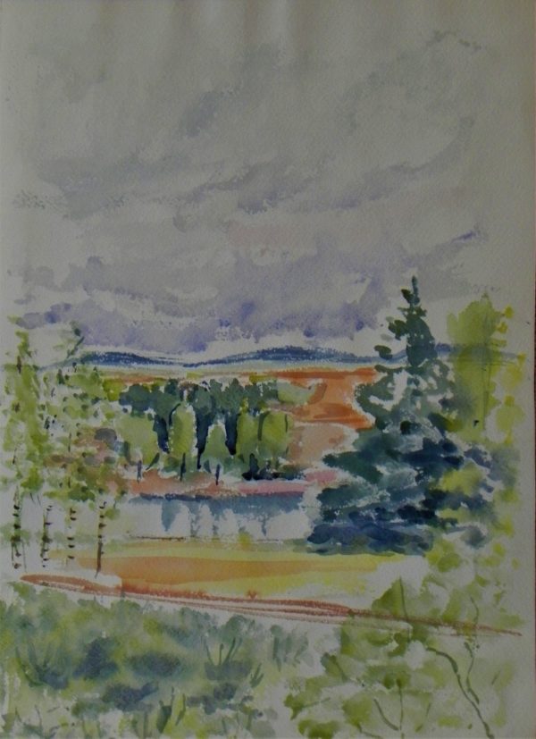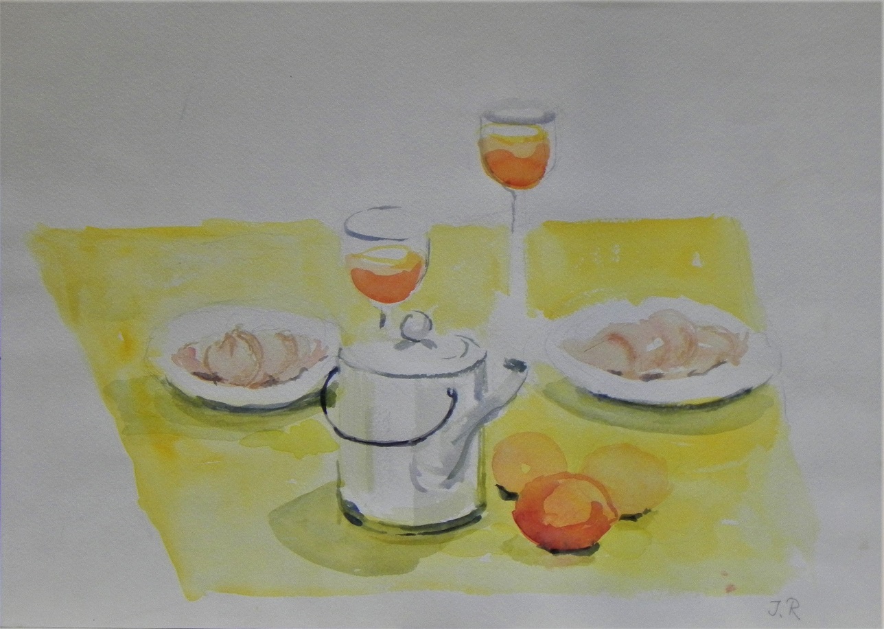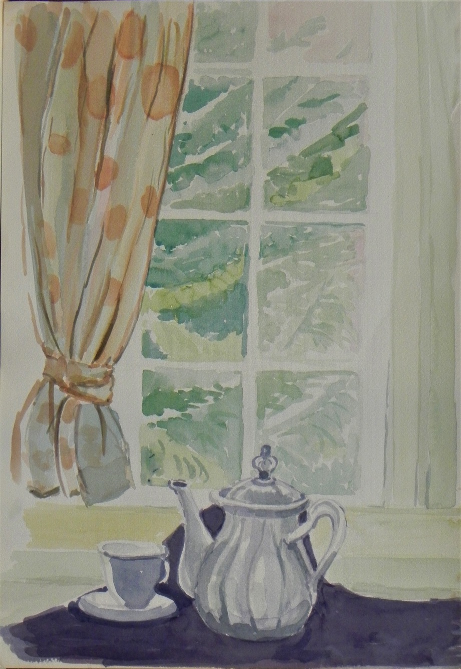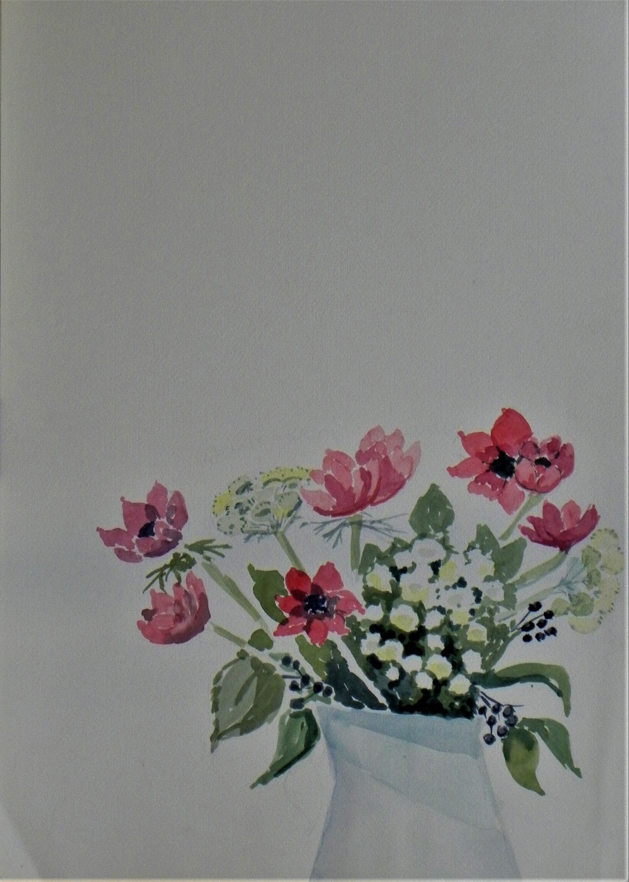Ooit gekocht op een veiling omdat vele aquarellen van de voor ons onbekende aquarellist uit deze kavel ons meer dan aanspraken. In totaal zijn het er – variërend van bloemstillevens tot cultuurbossen en van interieurs tot fantasiefiguren – vierenveertig.