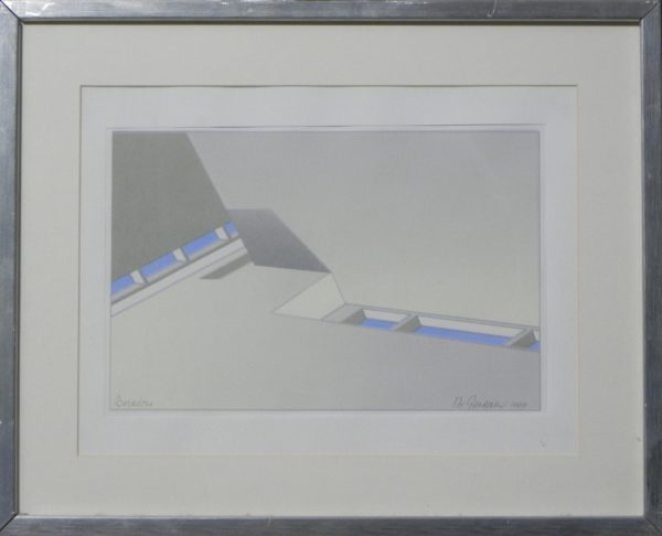 Een computer-based werkstuk van de ‘jonge’ computerkunstenaar Van Garderen. Spelend met lijnen, algoritmen en kleuren weet hij met deze litho tegelijkertijd zowel rust uit te stralen als de dynamiek van een grote stad te verbeelden.