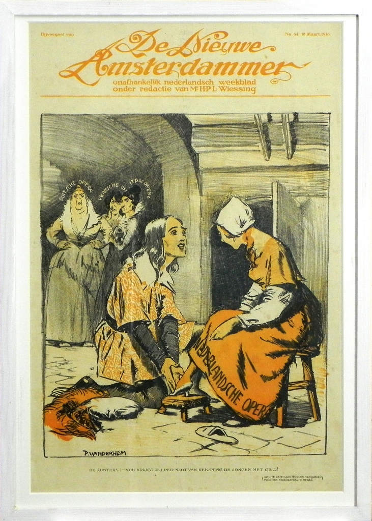 Piet van der Hem was als illustrator zeer breed georiënteerd. Van hem zijn zowel vele (kinder)boekillustraties, posters als leaflets bekend. Aan onze kunstverzameling werden dan ook in de loop der jaren zeer terecht tientallen tekeningen / litho’s / (kinder)boeken toegevoegd om een zo compleet mogelijk beeld van deze kunstenaar te krijgen. Hier één van de vele illustraties; in dit geval andermaal (zie ook CO 125.007) een ‘inleg’litho bij het onafhankelijk Nederlandsch weekblad de Nieuwe Amsterdammer (redactie: mr H.P.L. Wiessing).