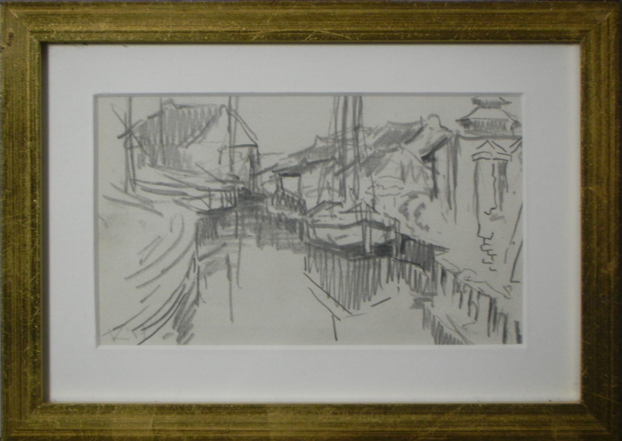 Een fraaie schets van een kusthaventje in het oude Nederlands-Indië. Goed is hierop te zien de vermenging van westerse en oosterse bouwculturen (strakke loodsen en een sierlijke Java-achtig gebouw). Vermoedelijk is hier sprake van een voorontwerp voor een schilderij.