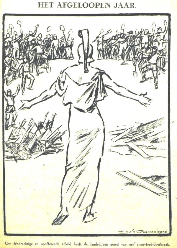 Kort samengevat is het wapen van Louis Raemaekers zijn soms dodelijke soms cabareteske potlood. Deze prent werd gepubliceerd in de Telegraaf in 1933 dus tussen de beide wereldoorlogen in. Ofschoon zeker geen pacifist of anarchist weet hij op onnavolgbare wijze de idiotie van toenmalige maatschappij op papier vast te leggen met veel oog voor maatschappelijke ontwikkelingen zoals de ongekende economische crisis tijdens de dertiger jaren. Maar ook op andere maatschappelijke gebieden was zijn ‘potlood’ vaak dodelijker dan welk wapentuig of schotschrift dan ook en dat niet alleen in Nederland. Tot ver buiten onze landsgrenzen waren zijn spotprenten dan ook befaamd.