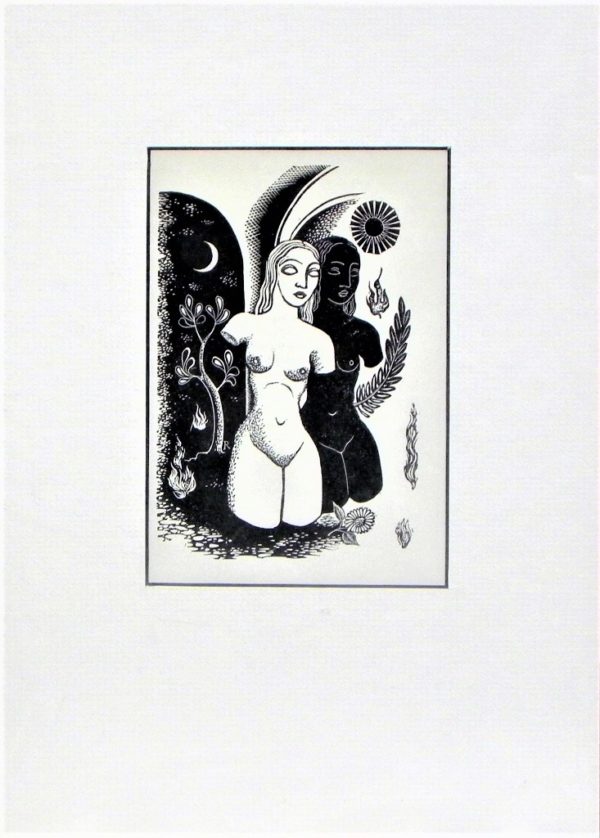 Twee symmetrische paspoppen. Dus zeg maar Pam Georg Rueter in het kwadraat. De intrigerende eenvoud van deze houtsnede boeit desondanks intens. Ook de tegenstelling dag-nacht draag hier zeker aan bij.
