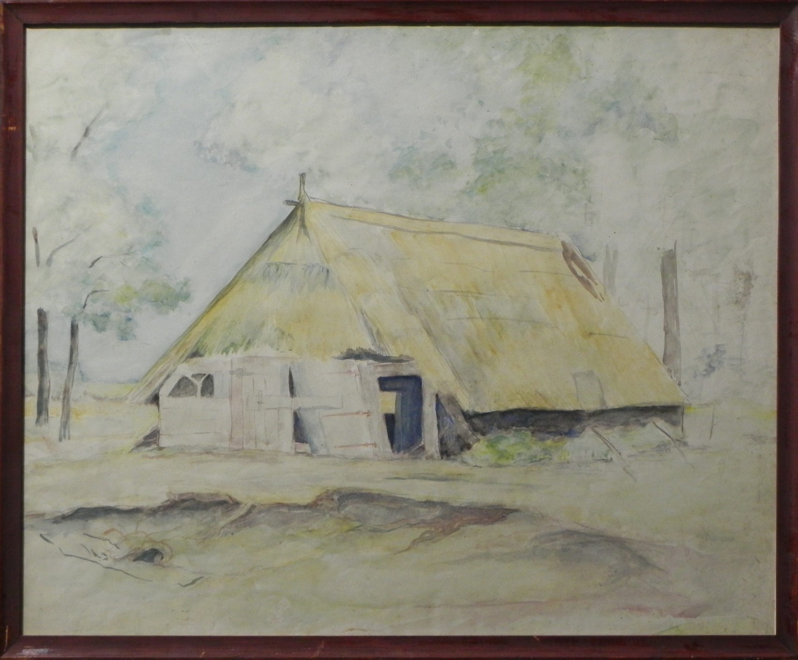 Jan van Straaten was karig met het publiek maken van zijn kunstwerken. Vele, vele tekeningen, aquarellen en proef-olieverven gingen vooraf aan een definitief werk. Bomen, figuren, bloemen, schuren, alles werd eerst uitvoerig (technisch) geoefend en zelfs in velerlei technieken voordat hij het ‘aandurfde’ ze onderdeel van zijn werk te laten zijn. Dit is dan zo’n product! In de door zijn familie vrijgegeven schets(en)(mappen) van Jan van Straaten (zie ook elders op deze website) worden vele elementen teruggevonden zoals houtopstanden en landschapselementen.