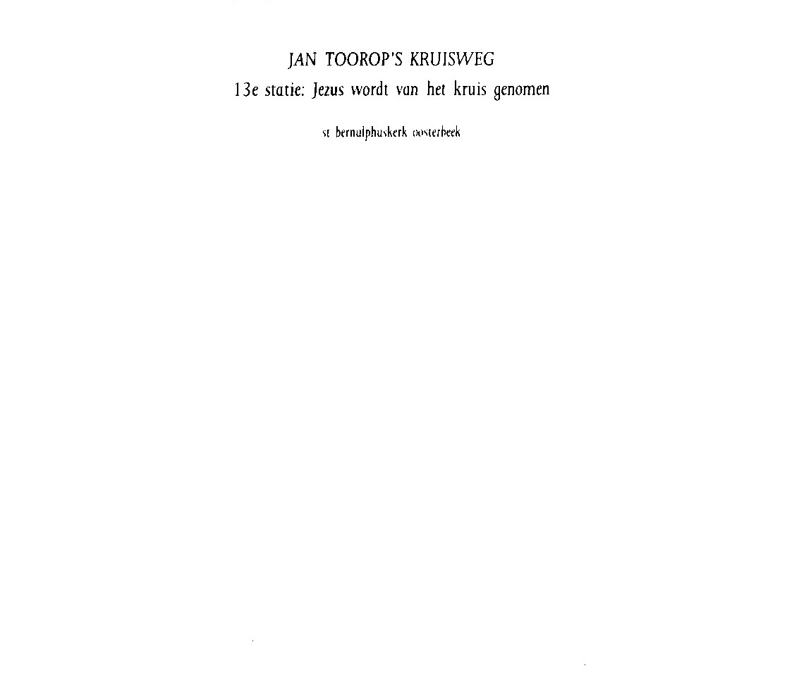Ooit lithografeerde Jan Toorop een veertiental staties bij wijze van beeldverhaal over de veroordeling van Jezus door Pilatus tot aan zijn graflegging. Hier de 13de Statie: