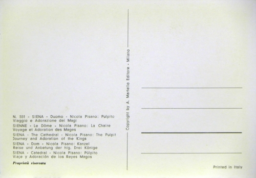 Van meerdere kunstenaars worden voortdurend – in dit geval van Nicola Pisano ver na zijn dood – kunstwerken verspreid via nadrukken of zoals in dit geval middels ansichtkaarten (zie onder andere ook COL 310.008). Deze werd uitgegeven door A. Martello, Milaan (zie de tweede foto, nr 551). Een terecht initiatief, want het basrelief- dat zich in de dom van Sienna bevindt – is van buitenklasse.