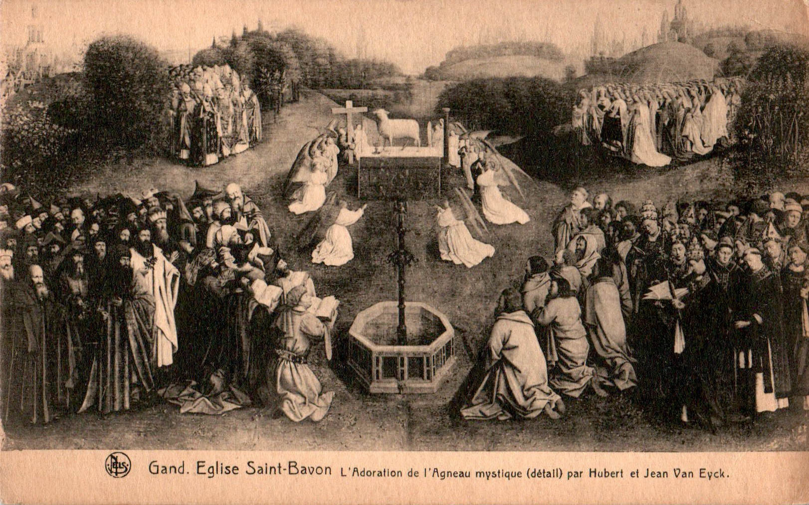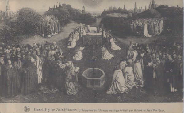 Van dit magistrale werk van de gebroeders van Eyck ‘Aanbidding van het Lam Gods’ zijn in de collectie zowel détail- (COL 1019.003, COL 1019.005.011b, COL 1019.005.011d) als overzicht-ansichtskaarten (COL 1019.003b en COL 1019.005.001 e.v.) opgenomen.