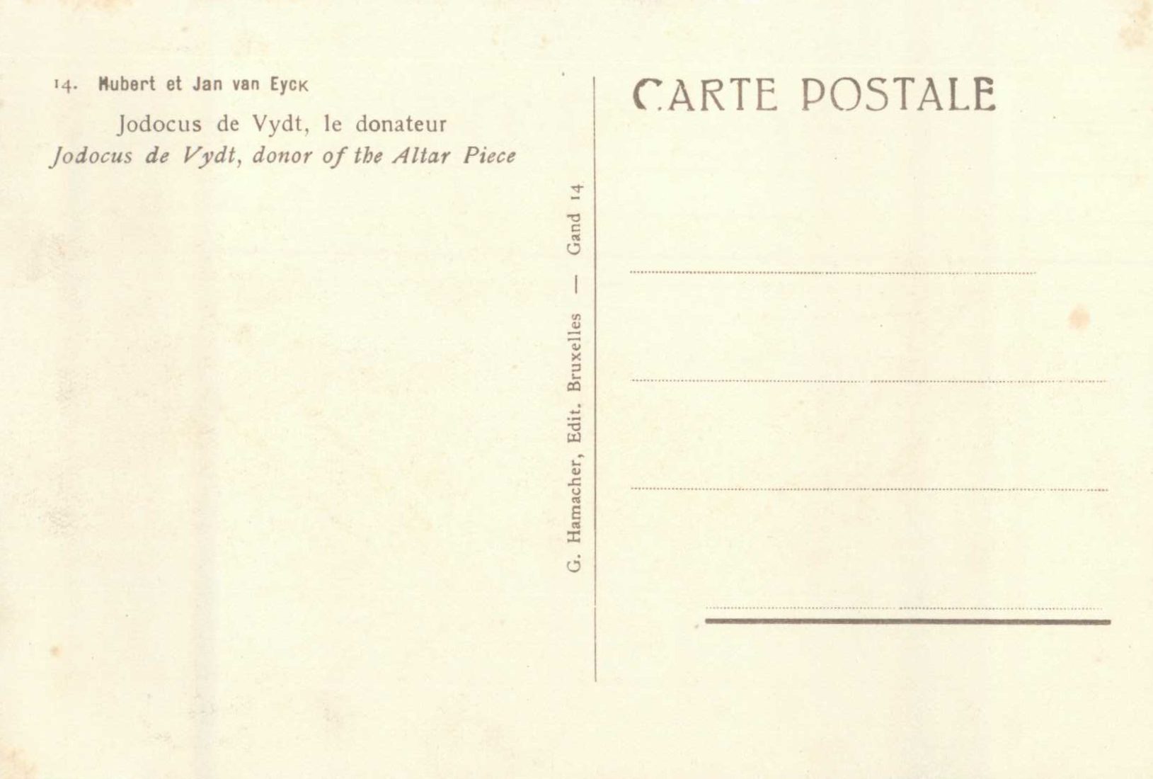 Van dit magistrale werk van de gebroeders van Eyck ‘Aanbidding van het Lam Gods’ zijn in de collectie zowel détail- (COL 1019.003) als overzicht-ansichtskaarten (COL 1019.003b en COL 1019.005.001 e.v.) opgenomen.