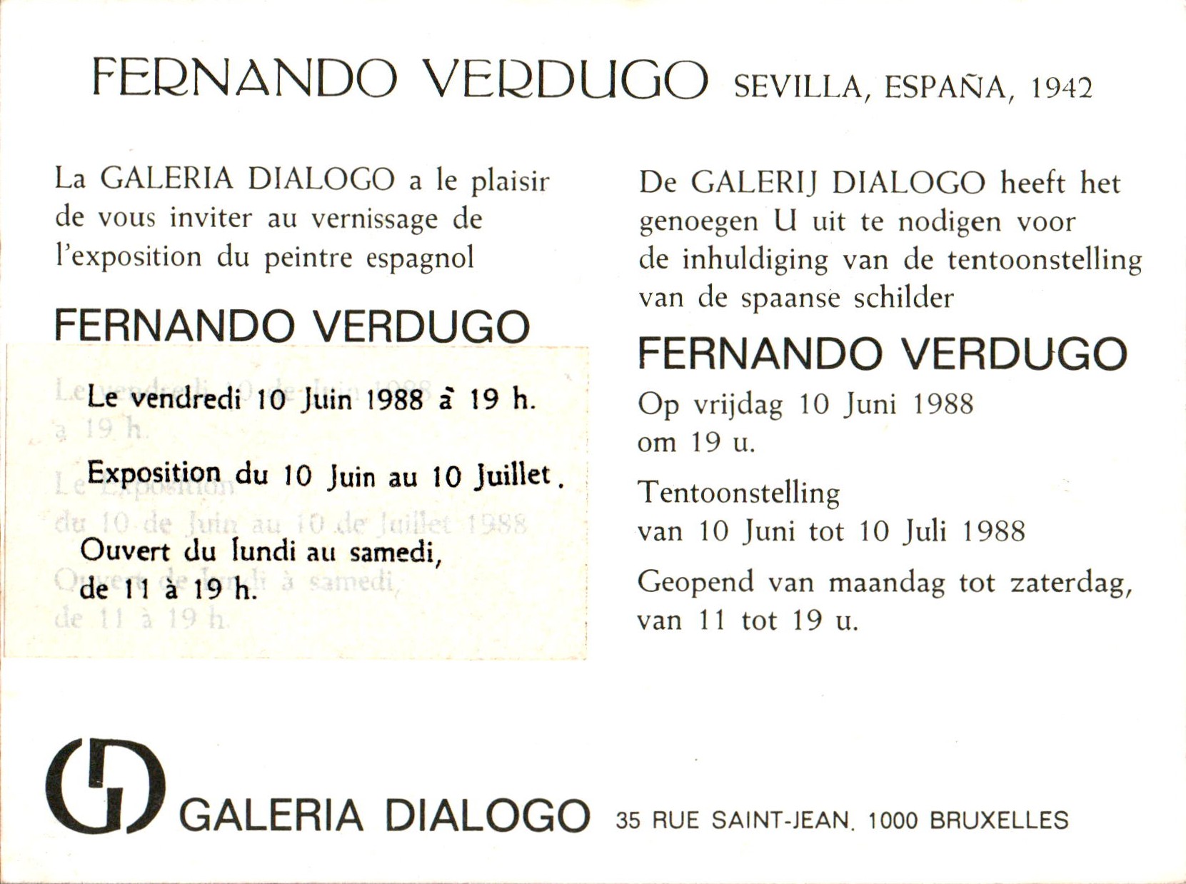 Dit is een reclamekaart van kunstgalerie Galeria Dialogo, Bruxelles.
