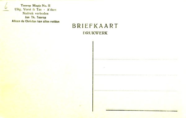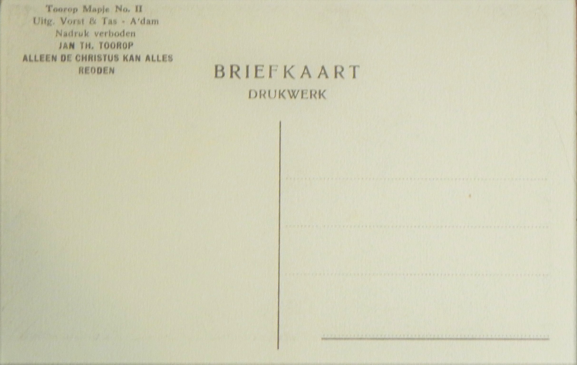 Van meerdere kunstenaars worden ook na hun dood nog kunstwerken verspreid via nadrukken of zoals in dit geval middels ansichtkaarten. En soms worden hun werken achteraf (zelfs seriematig) gedrukt en uitgegeven door meerdere uitgevers. Een terecht initiatief, want het werk van Toorop boeide en boeit nog steeds vele. En of het nu komt door zijn manier van tekenen, lithograferen of etsen dan wel de wijze waarop hij emoties weet toe te voegen aan schijnbaar minimale onderwerpen of personen, eenieder zal dat anders beleven.