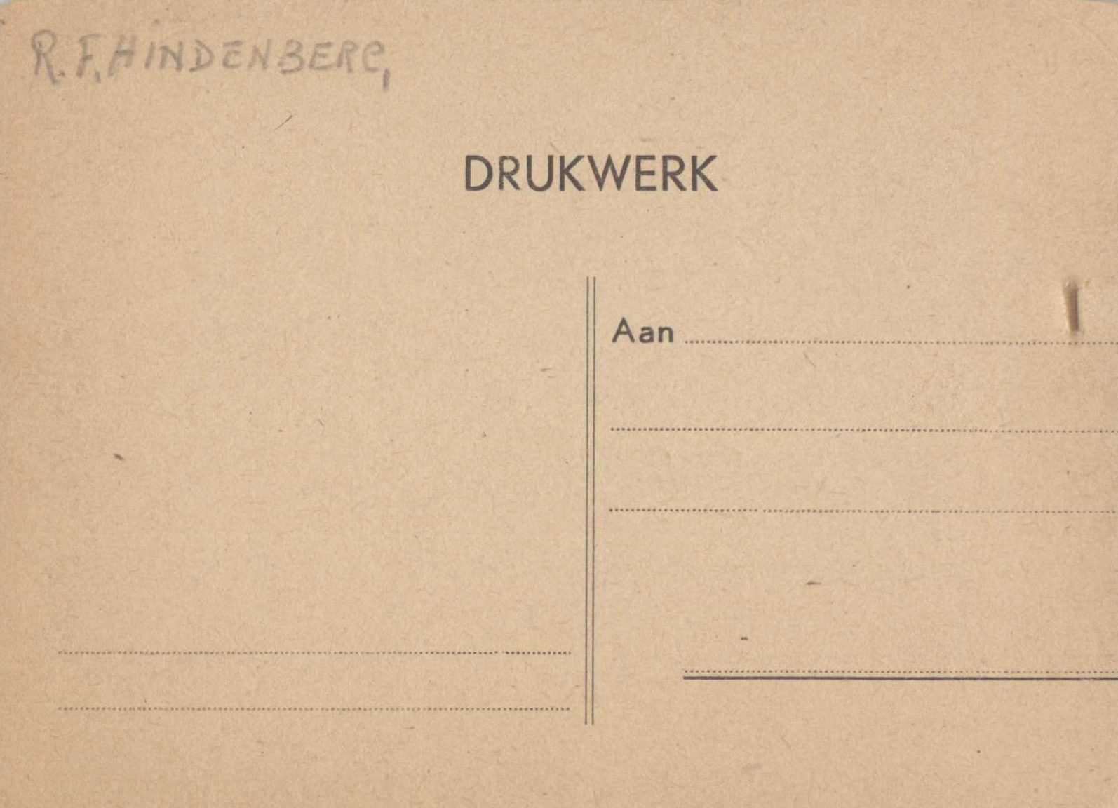Onduidelijk is het welke kunstenaar schuil gaat achter deze tekening. Zou het Cornelis de Bruin kunnen zijn die wel gebruik maakte van de pseudoniem ‘W. Hinderberg”. Op de schoonzijde valt in de druk de naam (signatuur?) R.F. Hindenberg of R. Hindenberg te lezen. Wie kan in deze ons verder op weg helpen?