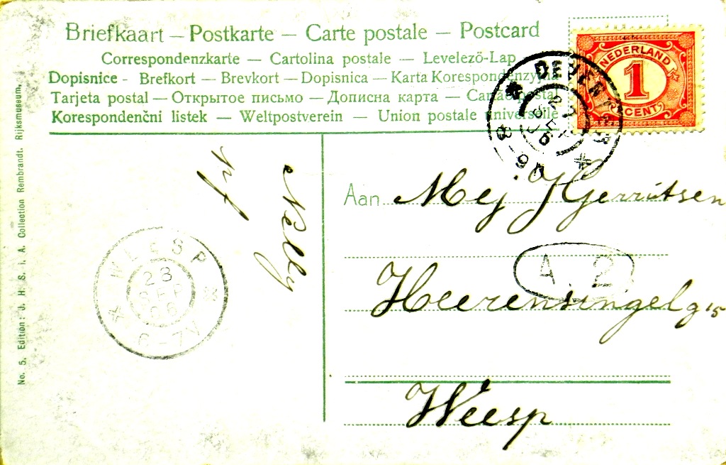 Van vele kunstenaars worden voortdurend – in dit geval van Rembrandt – kunstwerken verspreid middels ansichtkaarten. De uitgevers van deze ansichtkaarten zijn: Stengel & Co GmbH, Dresden; J.H.S. i. A. Collection Rembrandt, Rijksmuseum, Amsterdam, J. Vlieger, Weenenk, Hans Prell, Amsterdam en Snel (zie ook de foto’s). Het origineel bevindt zich in het museum Rembrandthuis, Amsterdam.