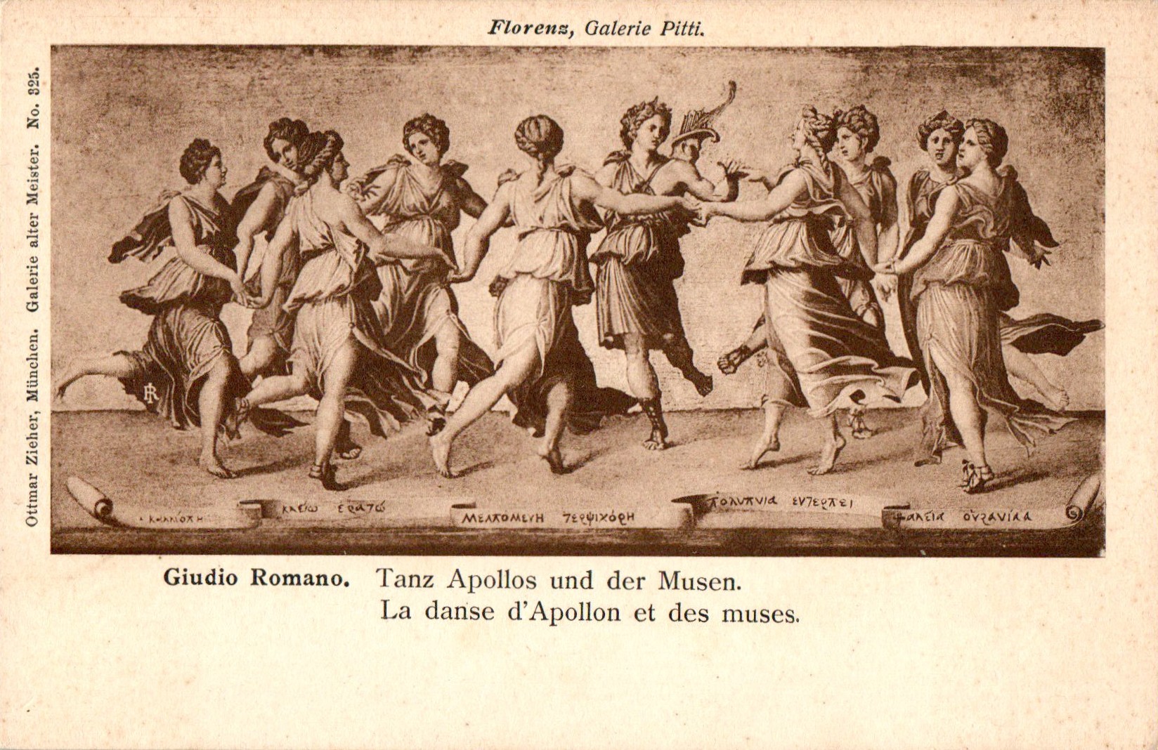 Opm.: De kunstenaar geassocieerd met het afgebeelde werk (dus museumkopie) is Giulio Romano (ook bekend als Giulio Pippi). Het specifieke werk op de ansichtkaart heet “De dans van Apollo met de Muzen” en bevindt zich in de Galleria Palatina (Palazzo Pitti) in Florence.