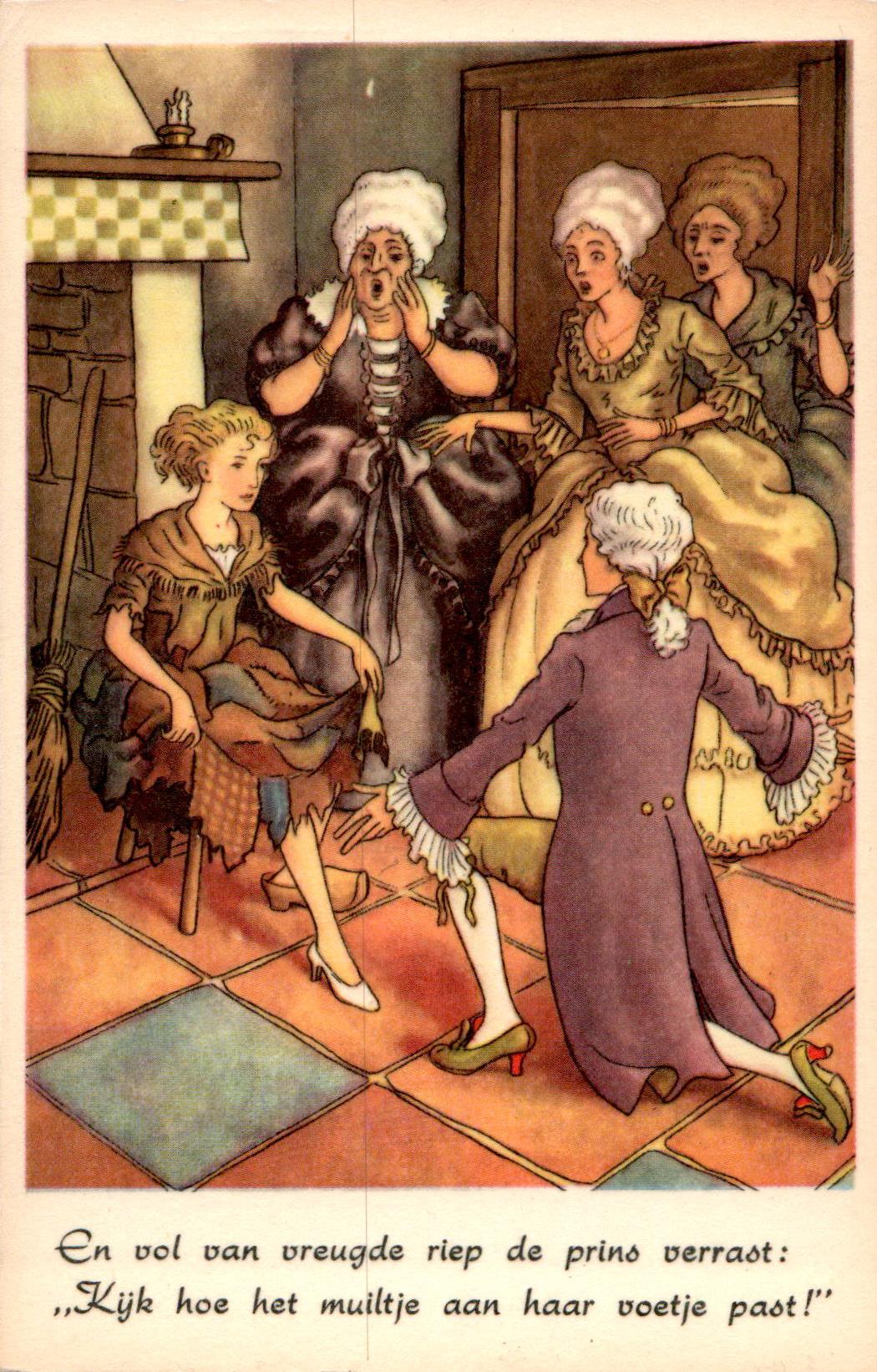 En vol van vreugde riep de prins verrast: “Kijk hoe het muiltje aan haar voeten past”.