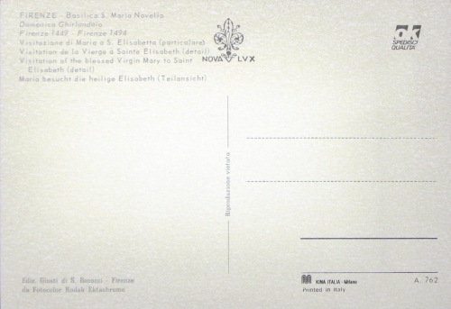 Van vele kunstenaars worden voortdurend – in dit geval van Domenico Ghirlandaio – kunstwerken verspreid middels ansichtkaarten. De uitgever van deze ansichtkaart is Ediz. Giusti di S. Becocci, Florence (zie ook tweede foto, nr. A 762). Het origineel bevindt zich in de Basilica di S. Maria Novella, Florence.