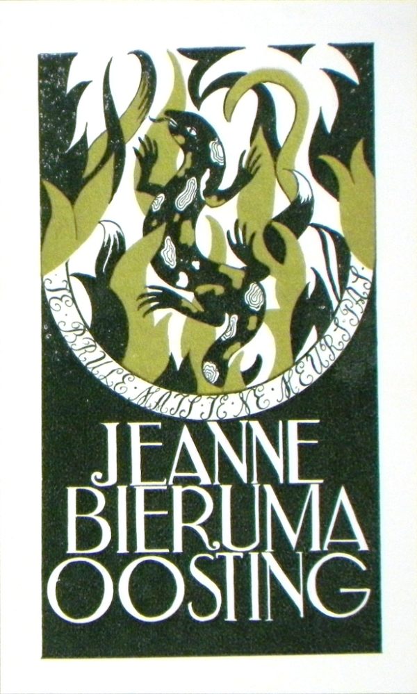 Jeanne Bieruma Oosting ontwierp niet alleen voor vele van haar vrienden en kennissen ex libris maar ook voor haarzelf. De spreuk die ze toevoegde aan haar eigen ex libris luidt: je brûle mais je se meurs pas (mogelijke vertaling: blaffende honden bijten niet?).