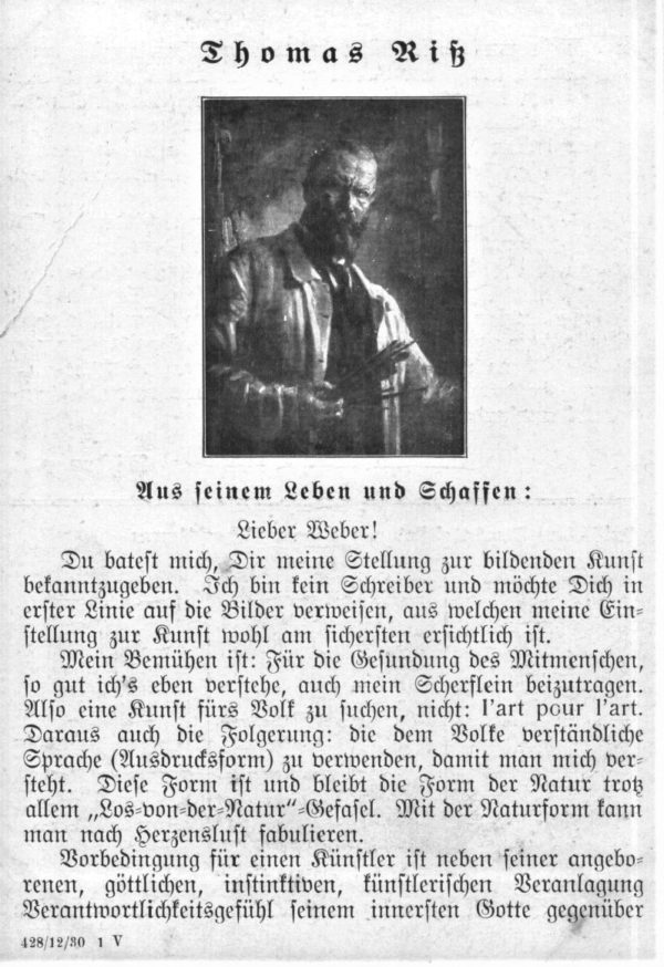 Thomas Riss werd op 7 december 1871 in Haslach (bij Stams) geboren e stierf op 27 oktober 1959 in Innsbruck. Over zijn mogelijk gevolgde kunstzinnige opleidingen is ons niets bekend. Hij schilderde vooral portretten. Daarnaast was hij actief als illustrator en auteur. Vermeld in Bénézit, Busse, Thieme / Becker, Volmer, Witt Checklist