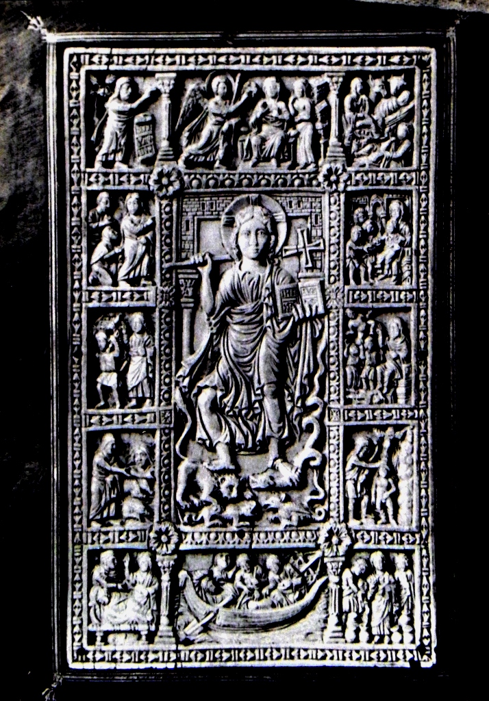 Ivoren snijwerk van een boekband van de Hofschool van Karel de Grote.