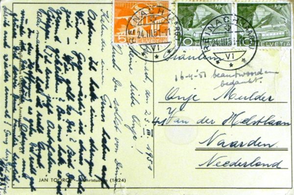 Van meerdere kunstenaars worden ook na hun dood nog kunstwerken verspreid via nadrukken of zoals in dit geval middels ansichtkaarten. En soms worden hun werken achteraf (zelfs seriematig) gedrukt en uitgegeven door meerdere uitgevers. Een terecht initiatief, want het werk van Toorop boeide en boeit nog steeds vele. En of het nu komt door zijn manier van tekenen, lithograferen of etsen dan wel de wijze waarop hij emoties weet toe te voegen aan schijnbaar minimale onderwerpen of personen, eenieder zal dat anders beleven.
