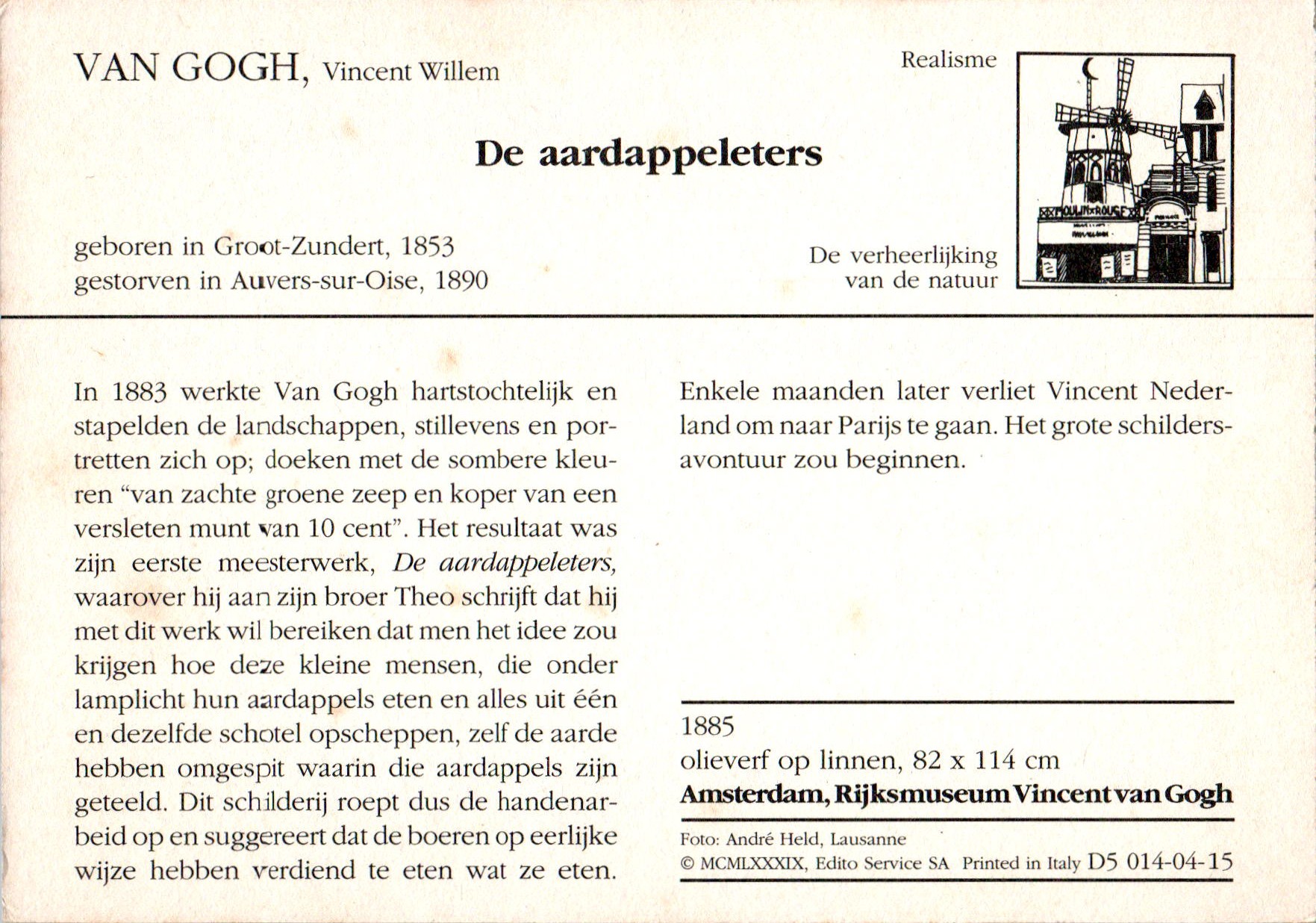 Van meerdere kunstenaars worden voortdurend – ook na hun dood nog – kunstwerken verspreid via nadrukken of zoals in dit geval middels ansichtkaarten. Deze werden uitgegeven door het Rijksmuseum Kröller-Müller, Otterlo en het Van Goghmuseum. Een terecht initiatief, want schilderijen van Vincent van Gogh boeien nog elke dag. En of het nu komt door zijn manier van tekenen of impressionistisch schilderen dan wel de wijze waarop hij emoties weet toe te voegen aan schijnbaar minimale onderwerpen of personen: eenieder zal dat op zijn eigen wijze beleven.
