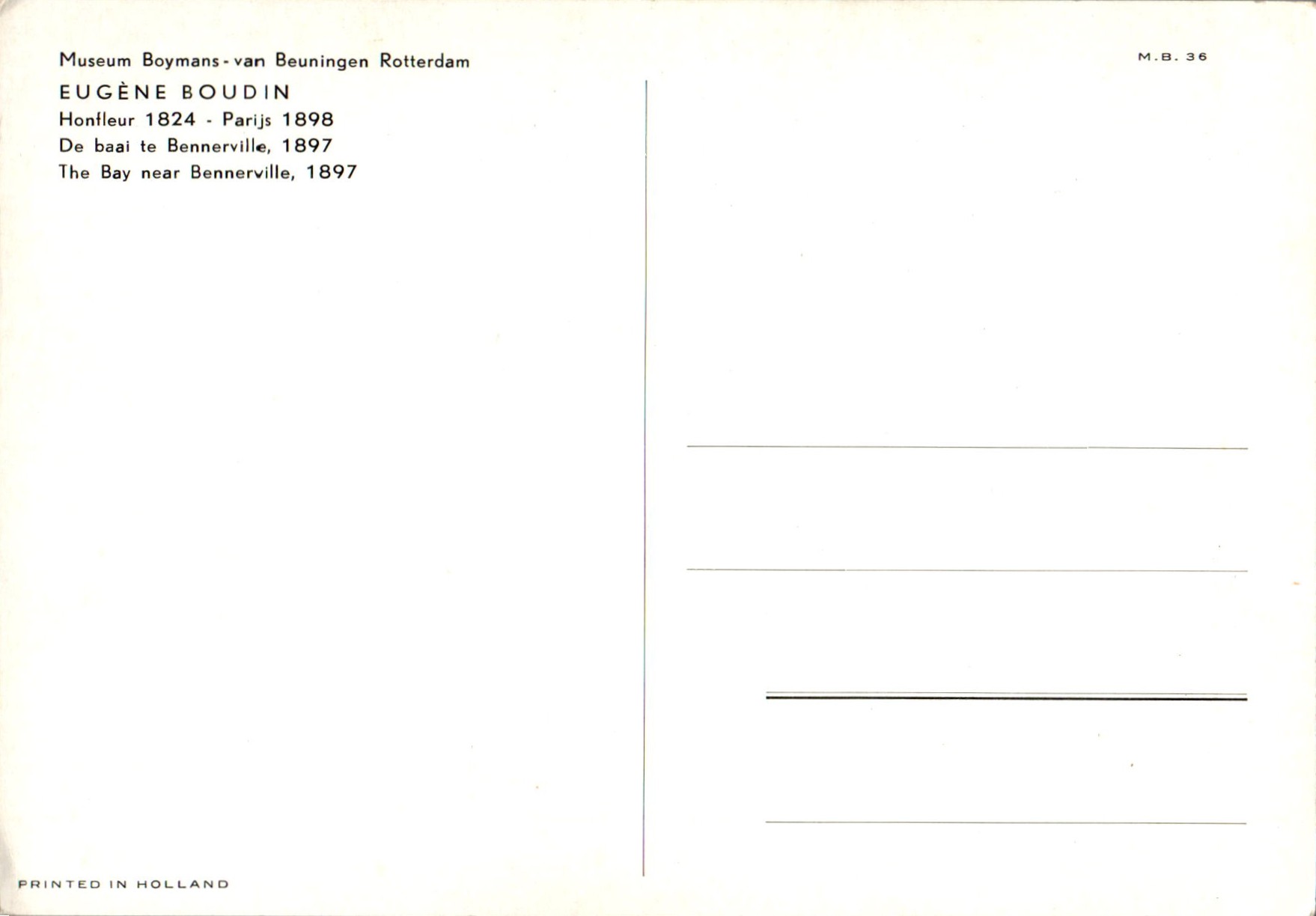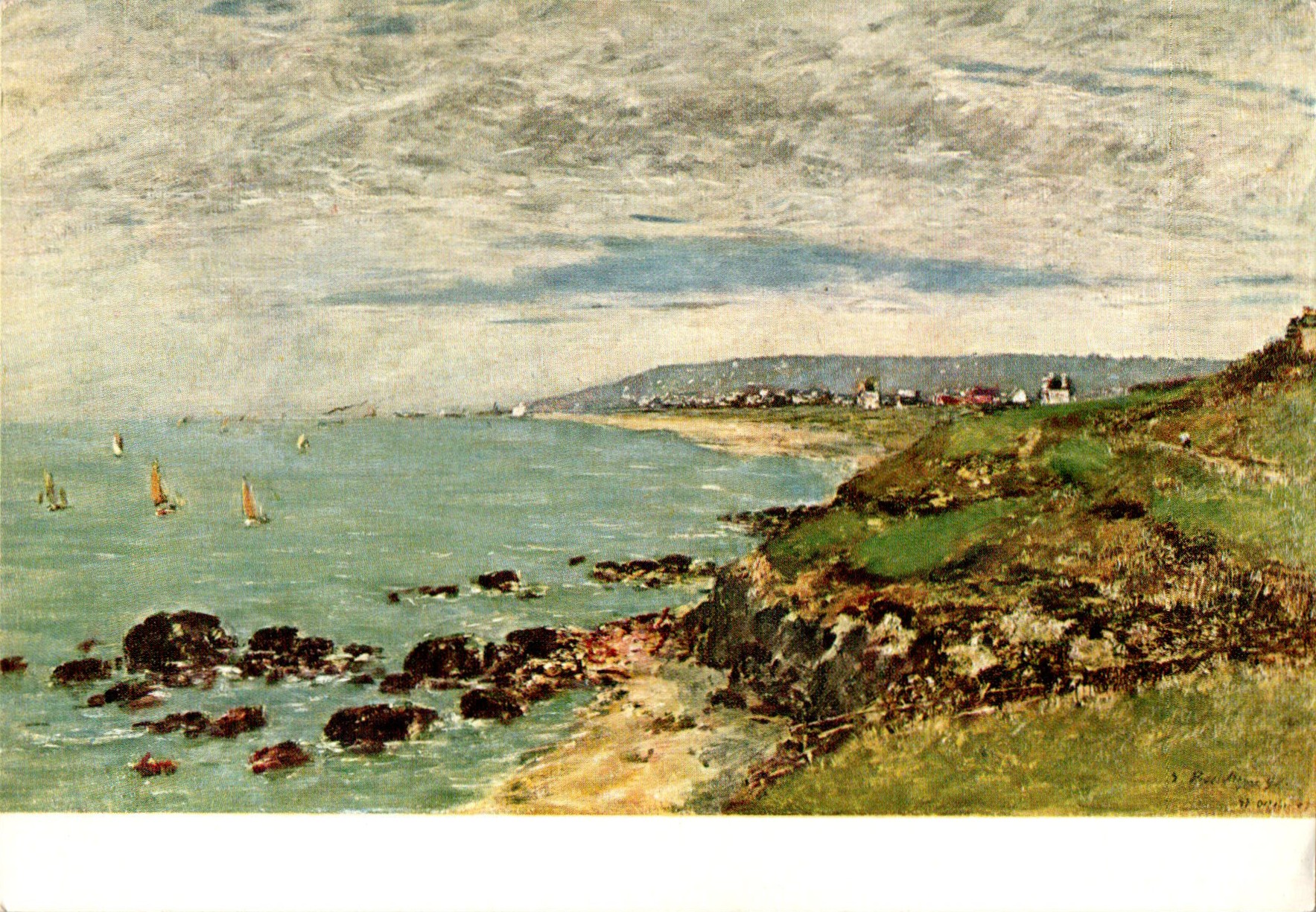 Eugène Boudin (naamvarianten: Louis-Eugène Boudin, Eugène-Louis Boudin; signeerde als Boudin) werd op 12 juli 1824 in Honfleur geboren en overleed op 8 augustus 1898 in Deauville. Van huis uit was hij lijstenmaker die alleen in zijn vrije tijd schilderde. Door zijn contacten met de bekende schilder Jean François Millet werd hem vaktechnisch de nodige kneepjes bijgebracht. Verder bekwaamde hij zichzelf door in het Louvre bekende schilderijen te kopiëren. Zijn winkel in schildersbenodigdhede...