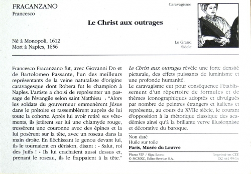 Van meerdere kunstenaars worden ook na hun dood nog kunstwerken verspreid via nadrukken of zoals in dit geval middels ansichtkaarten. Deze werd uitgegeven door Edito-Services S.A. (zie de tweede foto, Nr. KR D2 441 95-14). Een terecht initiatief, want het toenmalige werk van Franseco Fracanzano boeide en boeit nog steeds velen. Vooral zijn manier van schilderen zal door velen als bekend worden beleefd. Het oorspronkelijke werk zelf bevindt zich in het Musée du Louvre, Parijs.