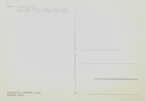 Van vele kunstenaars worden voortdurend – in dit geval van Giovanni Antonio Bazzi – kunstwerken verspreid middels ansichtkaarten. De uitgever van deze ansichtkaart is Lombardi, Siena (zie ook tweede foto, nr. 97). Het origineel bevindt zich in het Palazo Pubblico, Siena.
