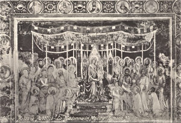 Van meerdere kunstenaars worden voortdurend – in dit geval van Simone Martini maar pas lange tijd na zijn dood – kunstwerken verspreid via nadrukken of zoals in dit geval middels ansichtkaarten. Deze werd uitgegeven door Lombardi, Siena (zie ook de tweede foto, nr. 10). Een terecht initiatief, want deze schildering verrast zelfs als ansichtkaart. Het werk zelf bevindt zich in Palazzo Pubblico, Siena.