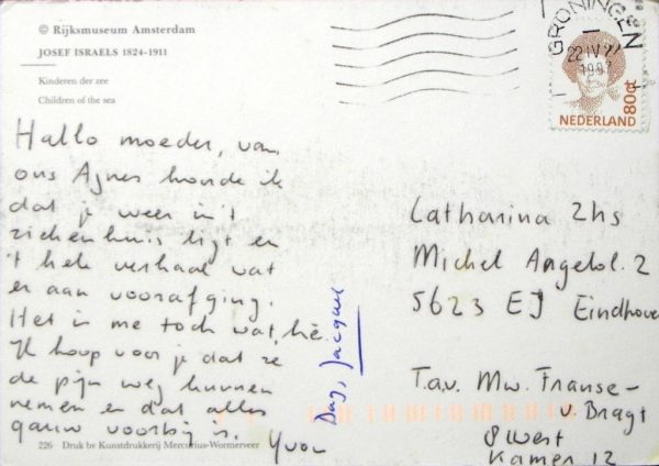 Van meerdere kunstenaars zoals van Jozef Israëls worden ook na hun dood nog kunstwerken verspreid via nadrukken of zoals in dit geval middels ansichtkaarten. Deze werd uitgegeven door de Algemeene Postvereeniging i.s.m. het Stedelijk Museum, Amsterdam (zie de eerste en tweede foto, nr.: J.V.A.). Een terecht initiatief, want het werk van Jozef Israëls boeide en boeit nog steeds velen. Het origineel bevindt zich in het Rijksmuseum, Amsterdam.