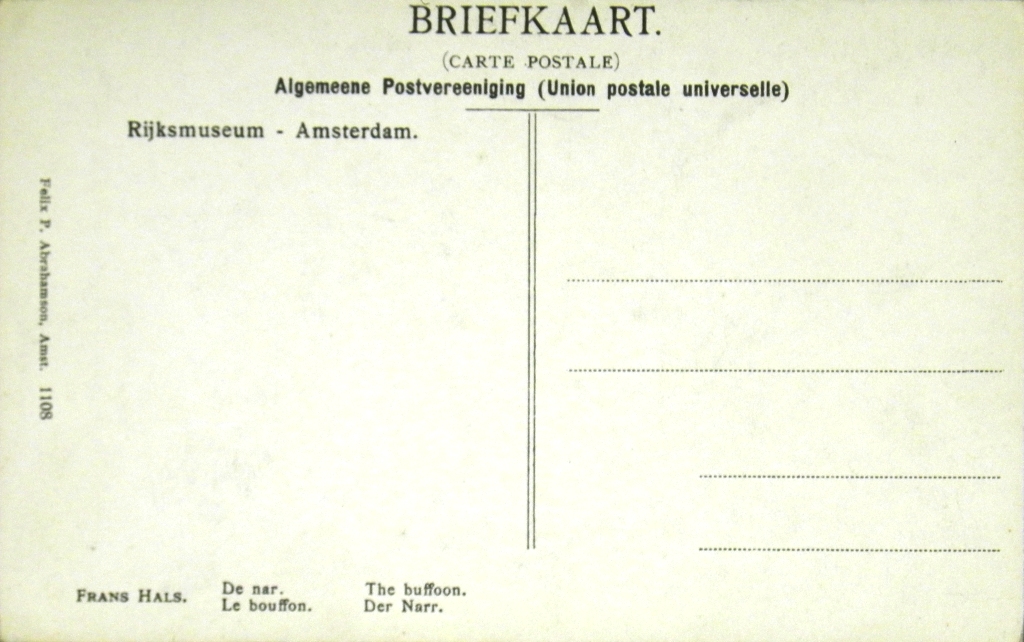 Van vele kunstenaars worden voortdurend – in dit geval van Judith Leyster – kunstwerken verspreid middels ansichtkaarten. De uitgever van deze twee ansichtkaart (Rijksmuseum Amsterdam, Museum het Louvre?). Het origineel bevindt zich in het Louvre, Parijs.