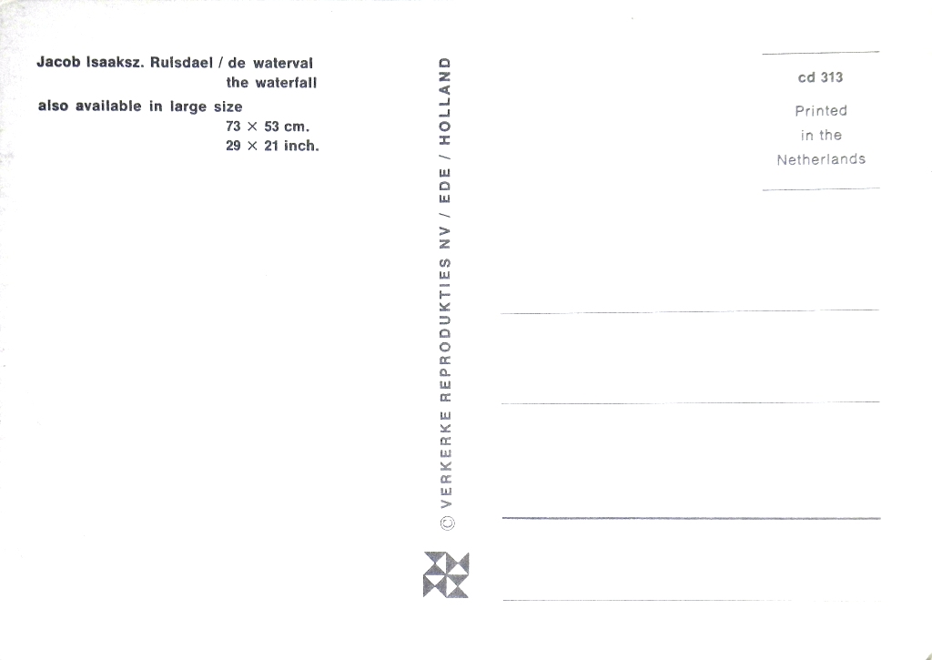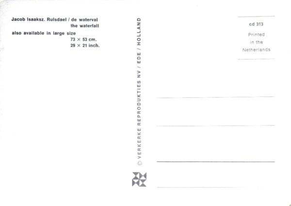 Van meerdere kunstenaars worden voortdurend – in dit geval van Jacob van Ruisdaal lang na zijn dood – nog kunstwerken verspreid via nadrukken of zoals in dit geval middels ansichtkaarten. Deze werd o.a. uitgegeven door Verkerke Reproducties NV, Ede (zie ook de tweede foto, Verwerke nr. cd 313 / CapuOvisnummer COL 1109.002b). Een terecht initiatief, want deze schildering boeit zelfs als ansichtkaart. Het werk zelf is eigendom van het Rijksmuseum, Amsterdam.