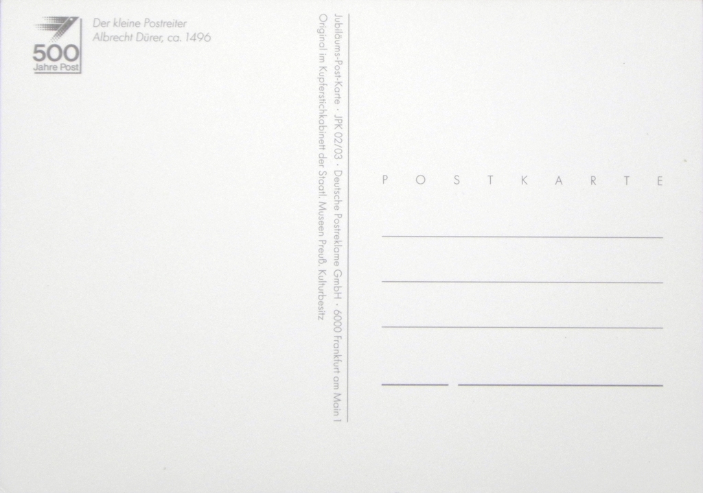Van meerdere kunstenaars worden voortdurend – in dit geval van Albrecht Dürer ver na zijn dood – kunstwerken verspreid via nadrukken of zoals in dit geval middels ansichtkaarten (zie onder andere ook COL 310.008). Deze werd uitgegeven door Deutsche Postreklame GmbH, Frankfurt am Main. (zie ook de tweede foto). Een bijzonder initiatief van Deutsche Post.