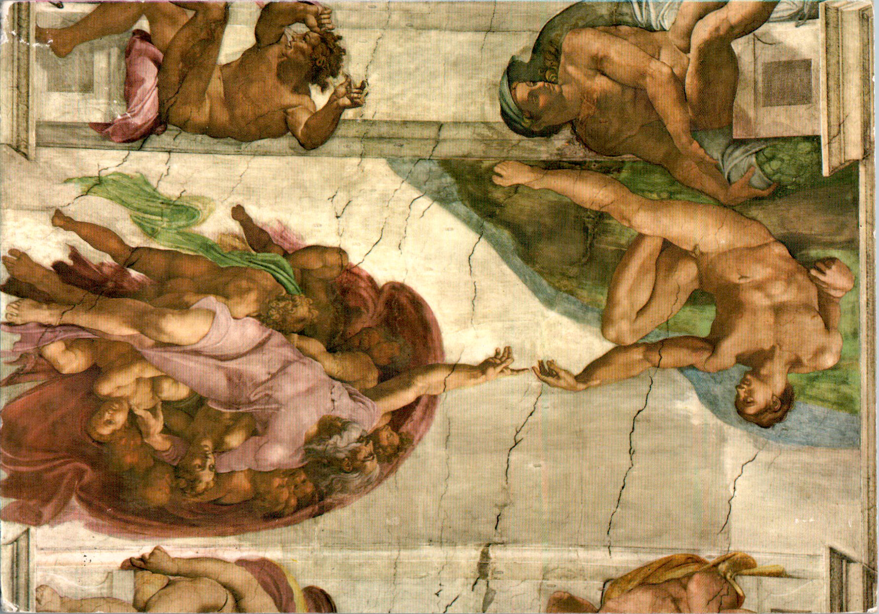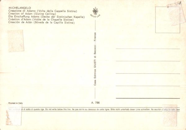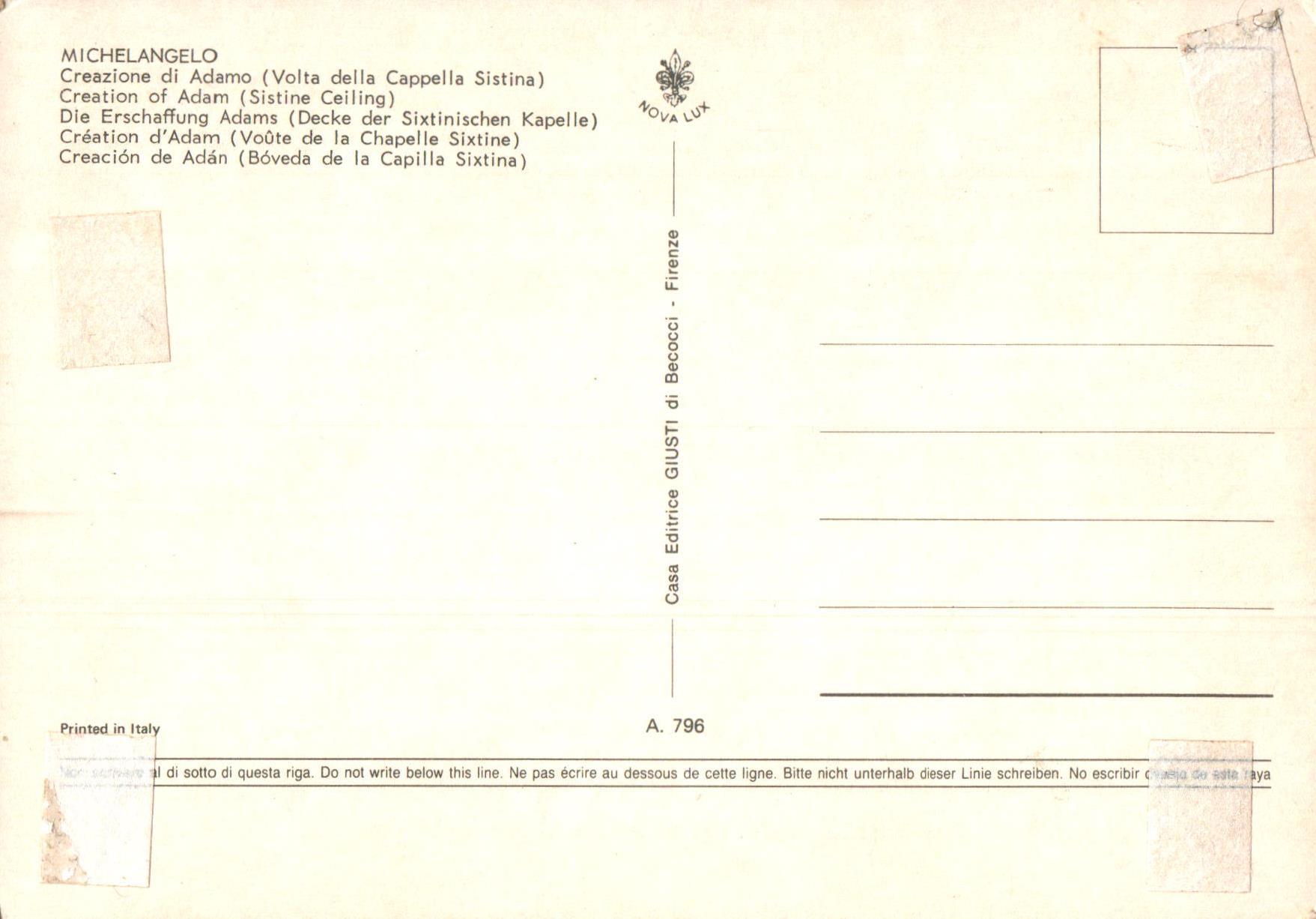Naast de detail ansichtkaarten (van de schepping van Adam) zijn ook kunstkaarten als zodanig van deze voorstelling [COL 897.010b, (10,5 x 15); COL 897.010d, (10,3 x 15); COL 897.010e, (8,7 x 14); COL 897.010f, (10,3 x 15)] van de complete compositie aan onze collectie toegevoegd.