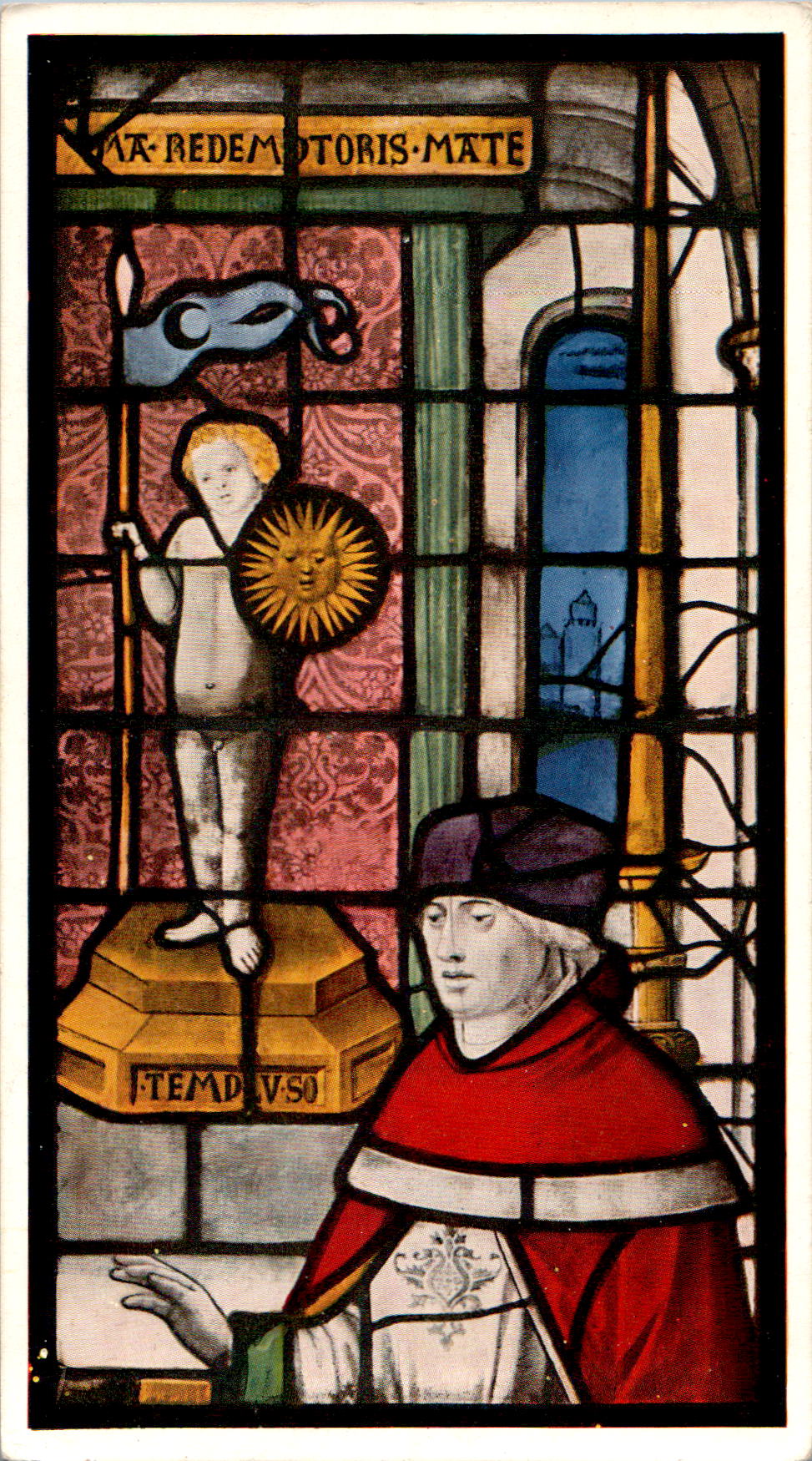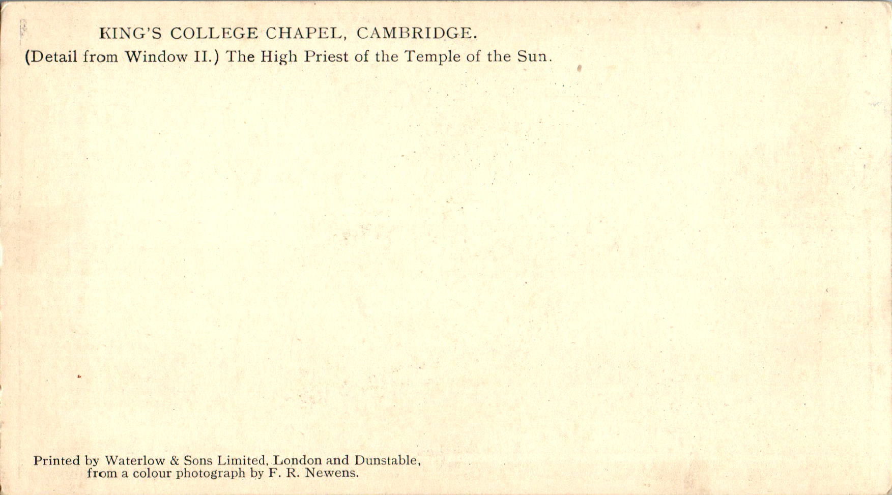 De tekst op de afbeelding beschrijft een detail van een raam in de King’s College Chapel in Cambridge. Het specifieke detail toont “De Hogepriester van de Tempel van de Zon”.