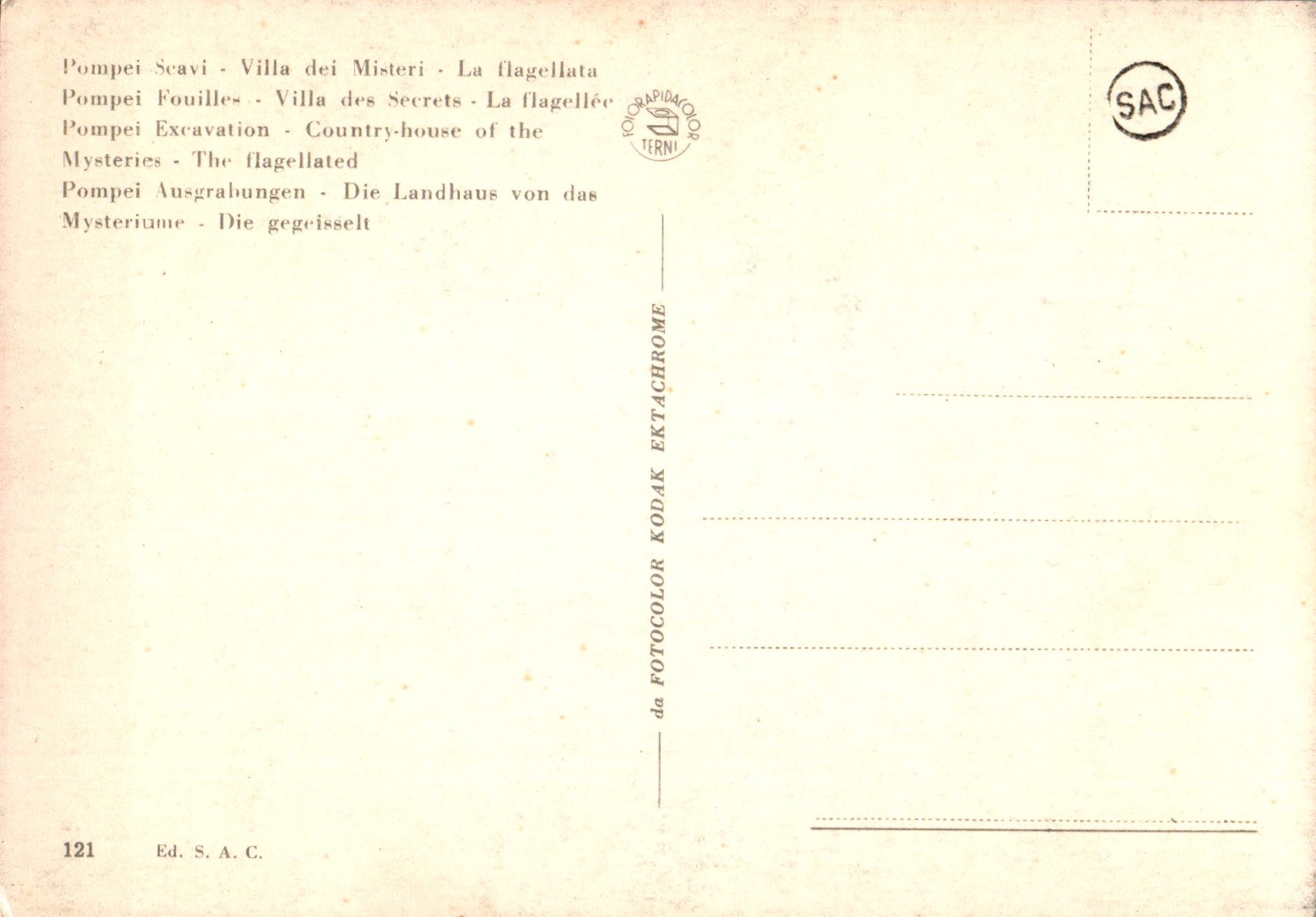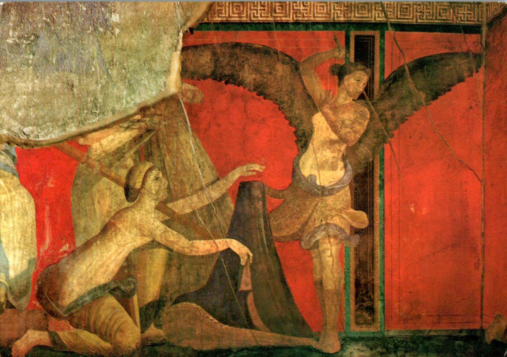 Deze afbeelding toont een detail van de beroemde fresco’s in de Villa van Mysteriën in Pompeii. De fresco’s beelden waarschijnlijk een inwijdingsritueel (mysteriën) van de cultus van Dionysos uit (knielende vrouw en een gevleugelde figuur, mogelijk een engel of godin, die een zweep hanteert).
