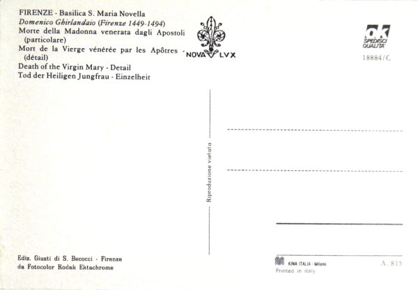 Van vele kunstenaars worden voortdurend – in dit geval van Domenica Ghirlandaio – nog lange tijd na hun dood – kunstwerken verspreid middels ansichtkaarten. De uitgever van deze ansichtkaart is Ediz. Giusti di S. Becocci, Florence (zie ook tweede foto, nr. A 815). Het origineel bevindt zich in de Balisica S. Maria Novella, Florence.