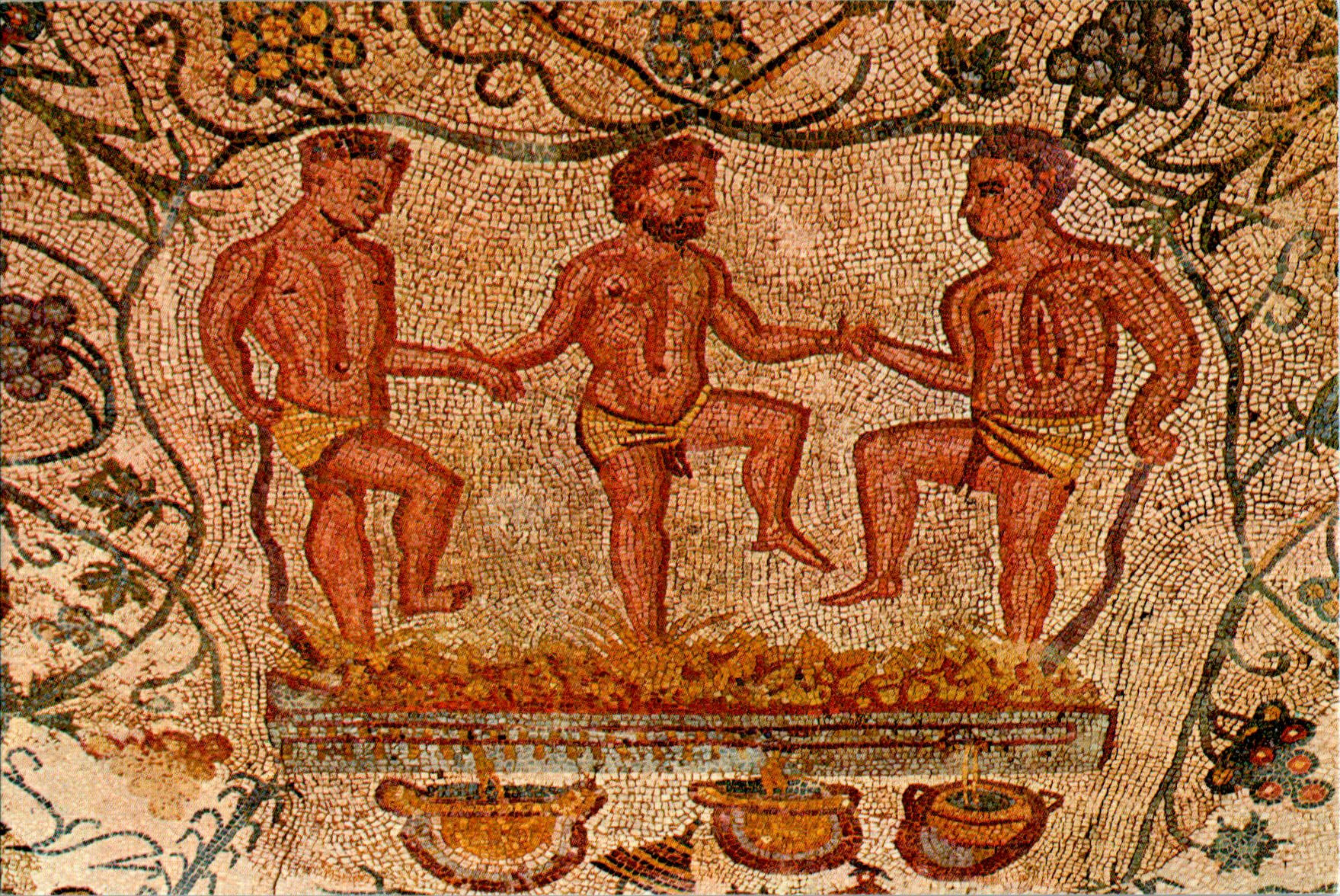 We zien drie mannen (slaven?) in een grote kuip met hun blote voeten bezig zijn om het sap uit druiven te persen.