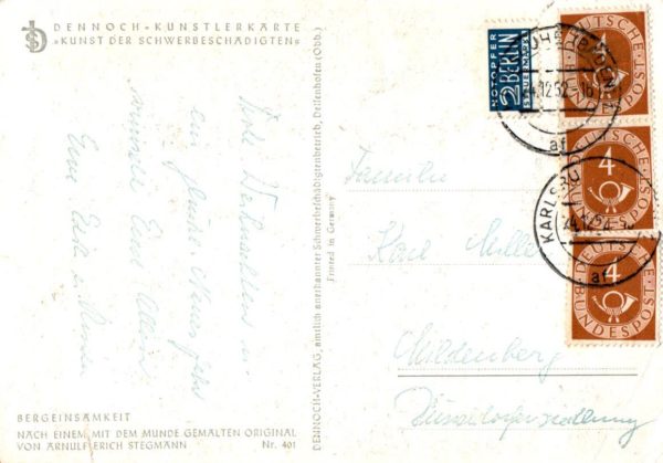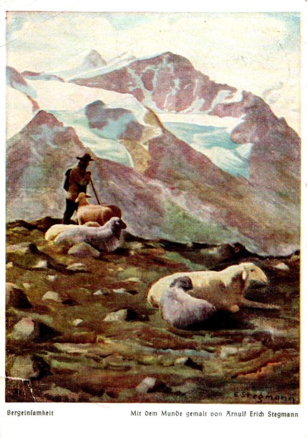 Prof Arnulf Erich Stegmann werd op 4 maart 1912 in Darmstadt geboren en overleed op 5 september 1984 in München. Hij kreeg op jonge leeftijd kinderverlamming. Hij volgde een kunstzinnige opleiding aan de Fachhochschule für Buchgewerbe und Grafiek in Neurenberg en volgde daarnaast lessen bij Erwin von Kormöndy en Hans Gerstacker.] In de periode 1953-1954 richtte hij de Lodge of Mouth and Foot Painting Artists op die later overging (1957) in de Vereinigung der Mund- und Fussmahlenden Küns...