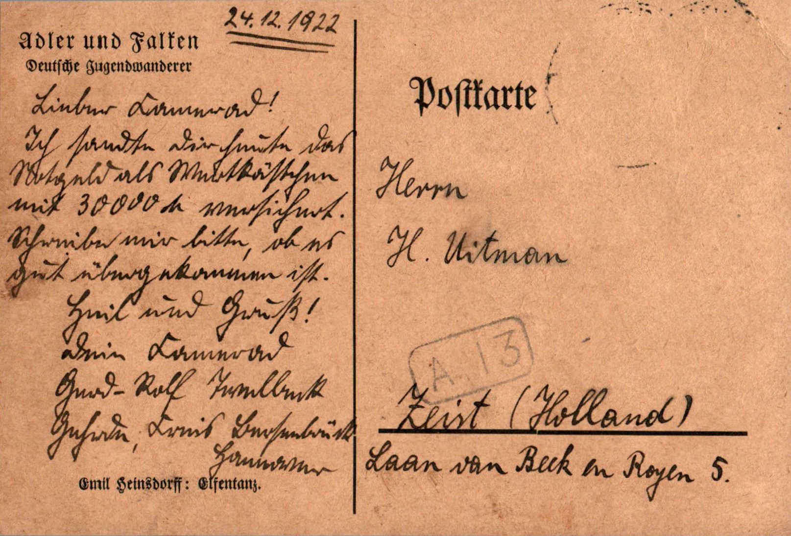 Emil Heinsdorff werd in 1863 geboren en overleed in 1948. Hij was actief als schilder en illustrator en nauw verbonden met de völkische cultuur en de jeugdbeweging in Duitsland. Zijn werk beeldde vaak romantische, natuurlijke scènes uit die de idealen van de vroege Duitse jeugdbonden weerspiegelden.