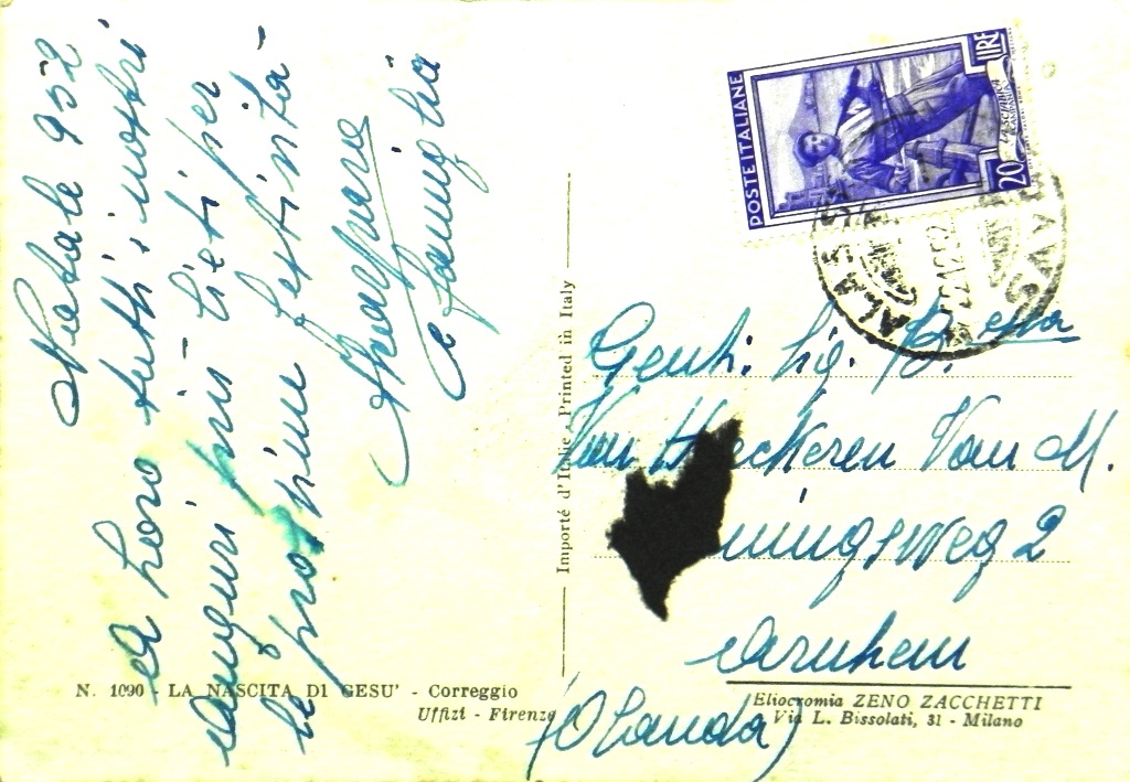 Van dit werk van Correggio zijn in de collectie zowel een kleuren- als een zw-ansichtkaartversie opgenomen [COL 1261.003, (15 x 10,4) resp. COL 1261.003b, (14,2 x 8,7)]. Tevens is een détailansichtkaart aan de collectie toegevoegd (COL 1261.003c).