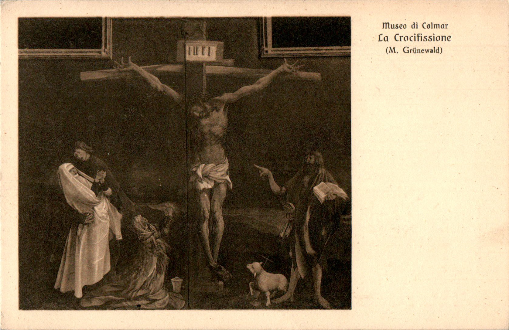 Een prentbriefkaart van het Isenheimaltaarstuk (Matthias Grünewald) dat begin 16de eeuw is gemaakt betreft een gebeeldhouwde en beschilderde polyptiek. Het werd oorspronkelijk gemaakt voor het Antonijnenklooster in Isenheim, dat gespecialiseerd was in ziekenhuiswerk voor mensen met huidziekten en de pest. De afbeelding van de gekruisigde Christus toont zweren die lijken op die van de pest, om te laten zien dat Jezus het lijden van de patiënten begreep en deelde (het kunstwerk bevindt zich momenteel in het Musée Unterlinden (Colmar, Frankrijk).