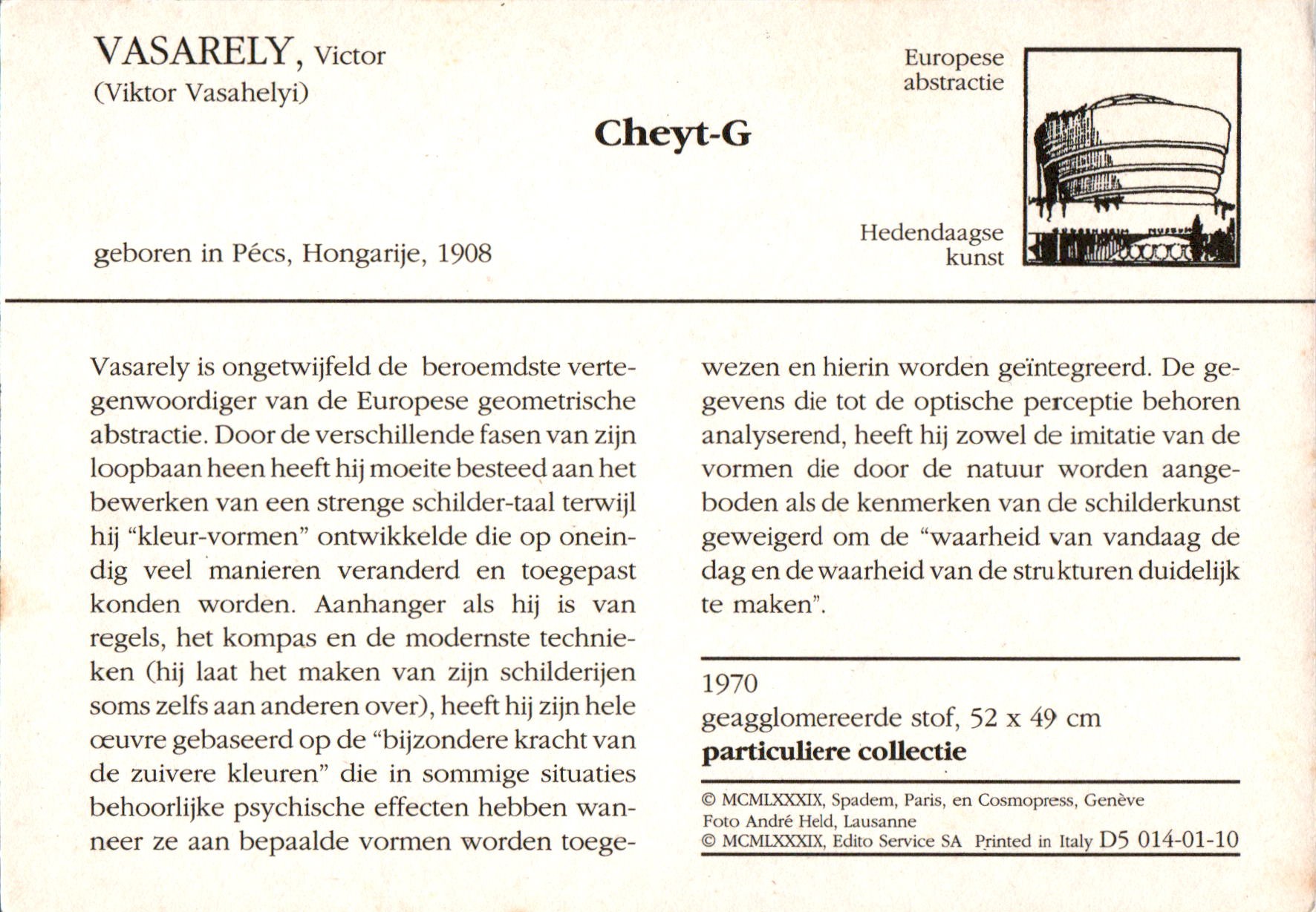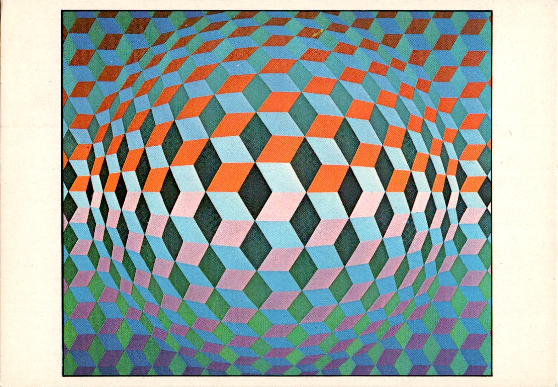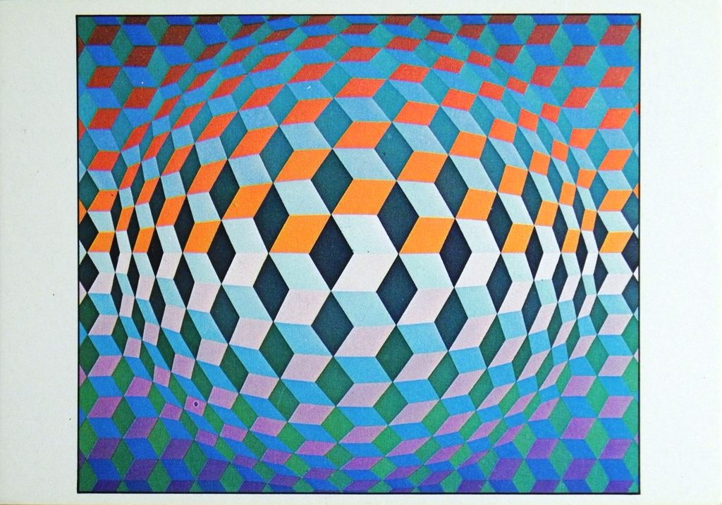 Van meerdere kunstenaars worden ook na hun dood nog kunstwerken verspreid via nadrukken of zoals in dit geval middels ansichtkaarten. Deze werd uitgegeven door Edito-Services S.A. (zie de tweede foto, Nr. KR D2 441 0197-10). Een terecht initiatief, want het werk van Victor Vasarely boeide en boeit nog steeds velen. Vooral zijn kubisme zal door velen als bekend worden beleefd. Het oorspronkelijke werk zelf bevindt zich in particulier bezit.