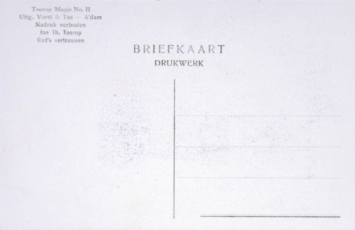 Van meerdere kunstenaars worden ook na hun dood nog kunstwerken verspreid via nadrukken of zoals in dit geval middels ansichtkaarten. En soms worden hun werken achteraf (zelfs seriematig) gedrukt en uitgegeven door meerdere uitgevers. Een terecht initiatief, want het werk van Toorop boeide en boeit nog steeds vele. En of het nu komt door zijn manier van tekenen, lithograferen of etsen dan wel de wijze waarop hij emoties weet toe te voegen aan schijnbaar minimale onderwerpen of personen, eenieder zal dat anders beleven.