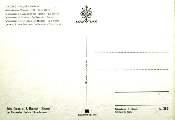 Van meerdere kunstenaars worden voortdurend – ook nog langere tijd na hun dood – kunstwerken verspreid via nadrukken of zoals in dit geval middels ansichtkaarten. Deze werd uitgegeven door de Italiaanse Post / Ed. Montinari & Abucci, Florence (zie de tweede foto). Een terecht initiatief, want het beeldhouwwerk van Michelangelo Buonarotti – dat zich in de Kapel van de Medici’s in Florence bevindt – is van een meer dan uitzonderlijke klasse.
