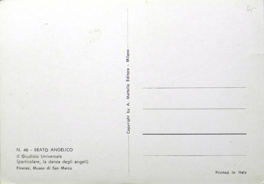 Van vele kunstenaars worden voortdurend – in dit geval van Beato Angelico – kunstwerken verspreid middels ansichtkaarten. De uitgever van deze ansichtkaart is Ediz. Giusti di S. Becocci, Florence (zie ook tweede foto, nr. A 169). Het origineel bevindt zich in het Museo San Marco, Florence.