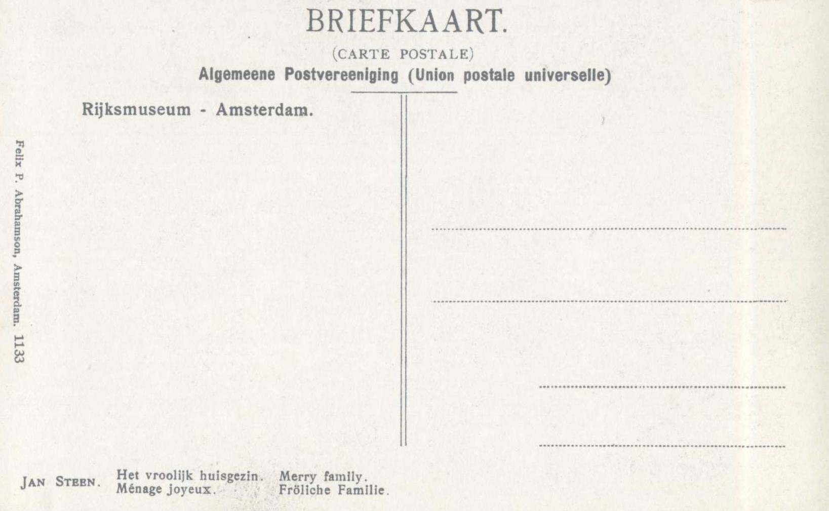 Dit werk van Jan Steen werd ook uitgegeven als briefkaart (COL 954.016b) door ene Dr. A.K. Oort als waarschuwing tegen het gebruik (door jongeren) van alcohol met als titel: Zoo de ouden zongen, piepen de jongen. COL 954.016e is een door het Rijksmuseum uitgegeven ansichtkaartversie.