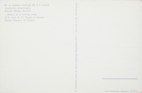 Van vele kunstenaars worden voortdurend – in dit geval van een onbekende kunstenaar – kunstwerken verspreid middels ansichtkaarten. De uitgever van deze ansichtkaart is M. Eğitim Bakanltiği Müzelerinde, Istanbul (zie ook tweede foto). Het origineel bevindt zich in het Mozaic Museum, Istanbul.