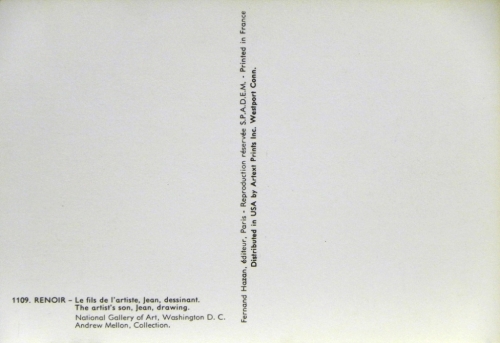 Van meerdere kunstenaars worden voortdurend – in dit geval van Auguste Renoir jaren na zijn dood – kunstwerken verspreid via nadrukken of zoals in dit geval middels ansichtkaarten (zie onder andere ook COL 310.008). Deze werd uitgegeven door Fernand Hazan, Parijs (zie ook de tweede foto, nr. 1109). Een terecht initiatief, want dit schilderij is van buitenklasse.