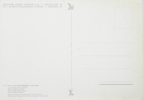 Van meerdere kunstenaars worden voortdurend – in dit geval van Henri de Braekeleer jaren na zijn dood – kunstwerken verspreid via nadrukken of zoals in dit geval middels ansichtkaarten. Deze werden uitgegeven door N.V. Kunstuitgeverijen Corten, Brussel en Boekhandel “De Heuvel”, Korten-Lo (zie ook de foto’s). Een terecht initiatief want dit schilderij is van grote klasse. Het origineel bevindt zich in de Koninklijke Musea voor Schone Kunsten van Brussel, Brussel.