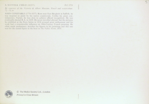 Van meerdere kunstenaars worden voortdurend – in dit geval van John Constable jaren na zijn dood – kunstwerken verspreid via nadrukken of zoals in dit geval middels ansichtkaarten (zie onder andere ook COL 310.008). Deze werd uitgegeven door The Medici Society Ltd, Londen (zie ook de tweede foto). Een terecht initiatief, want dit schilderij is van grote klasse. Het origineel bevindt zich in het Victoria and Albert Museum, Londen.